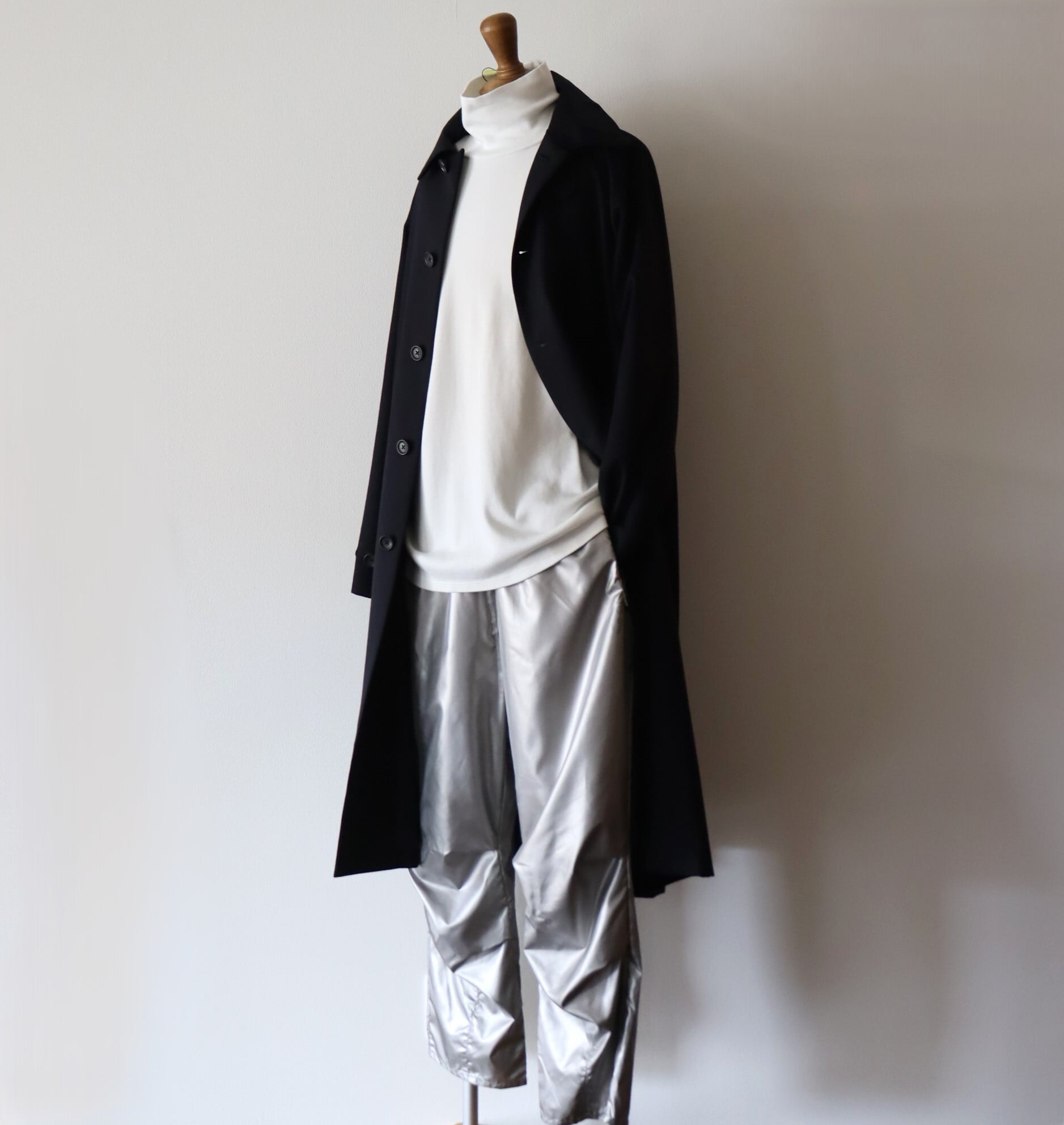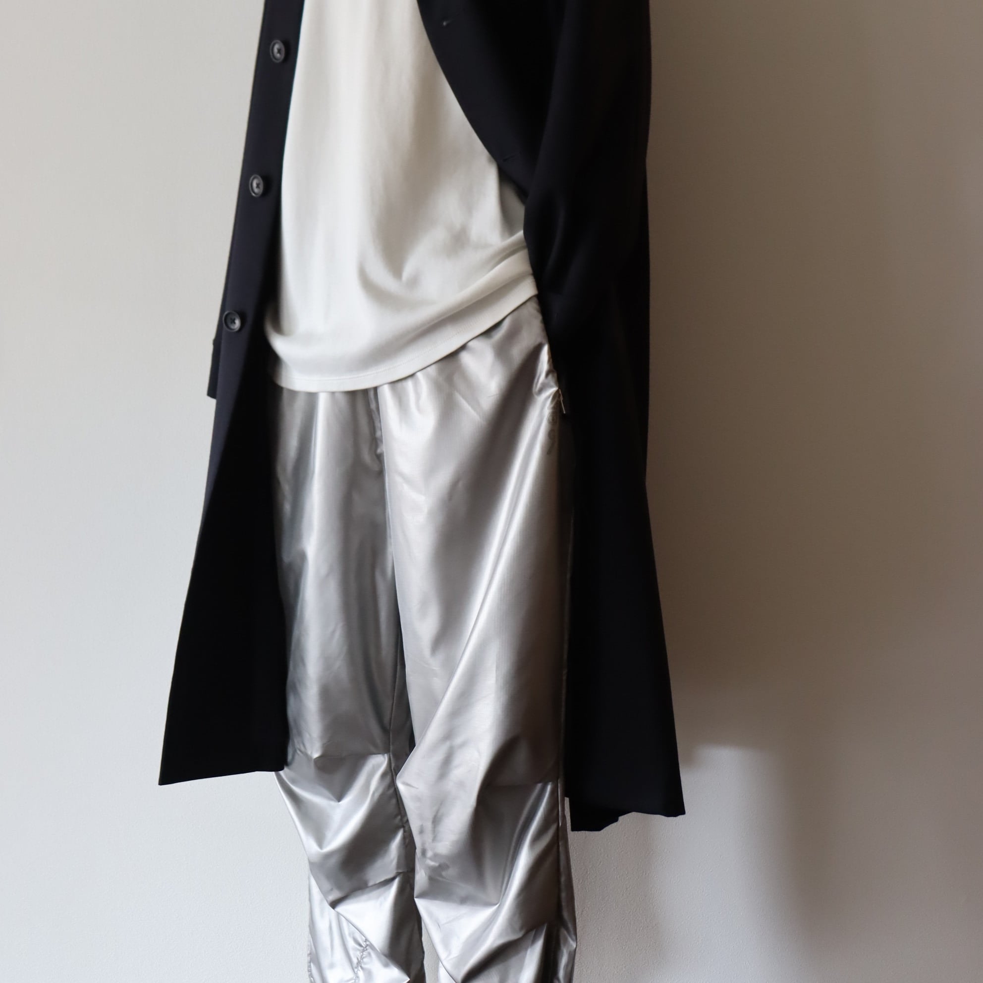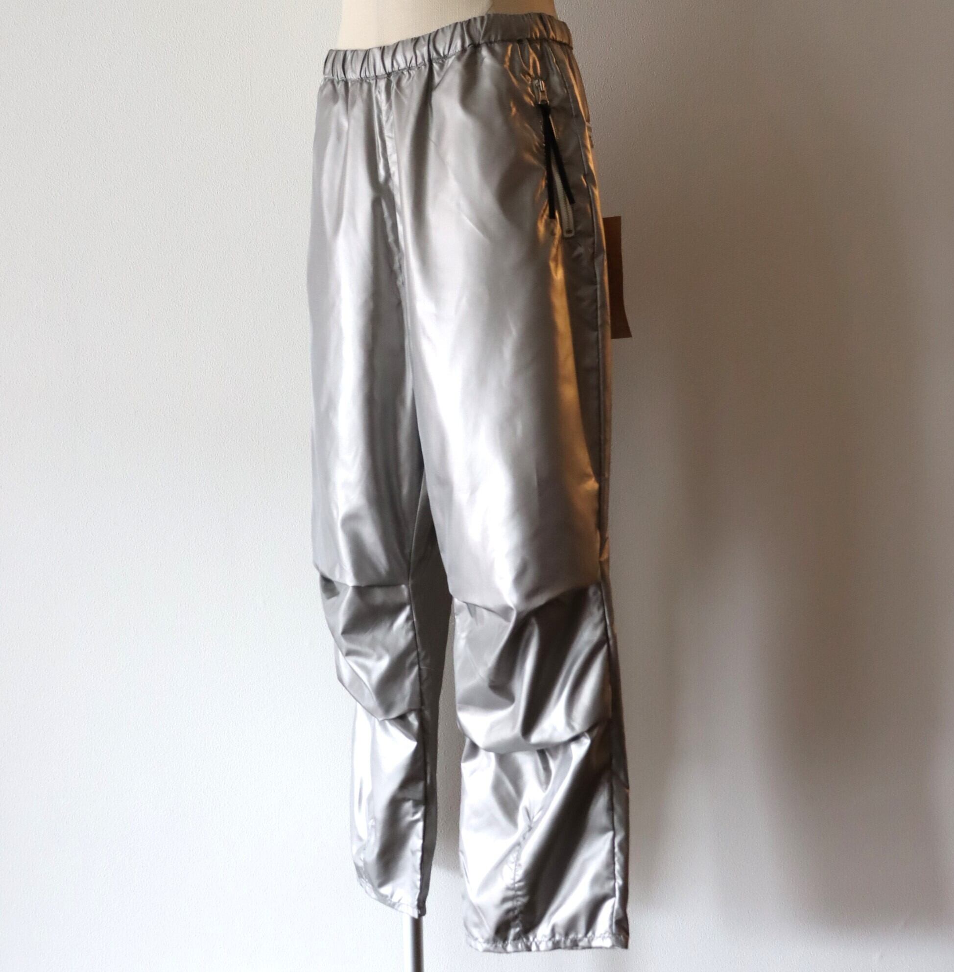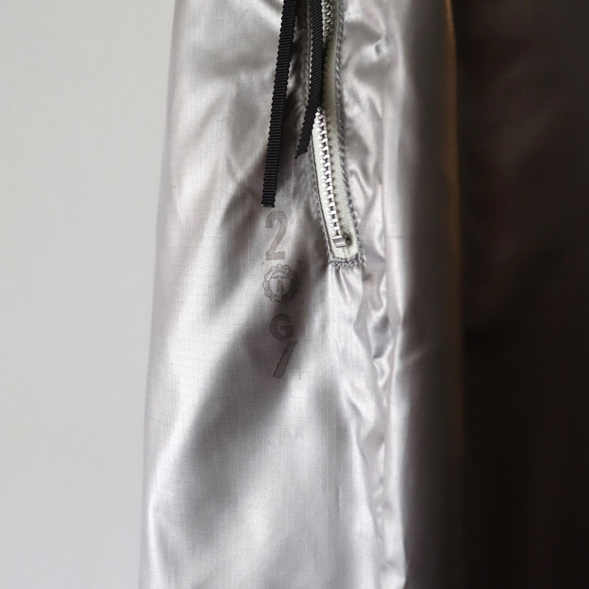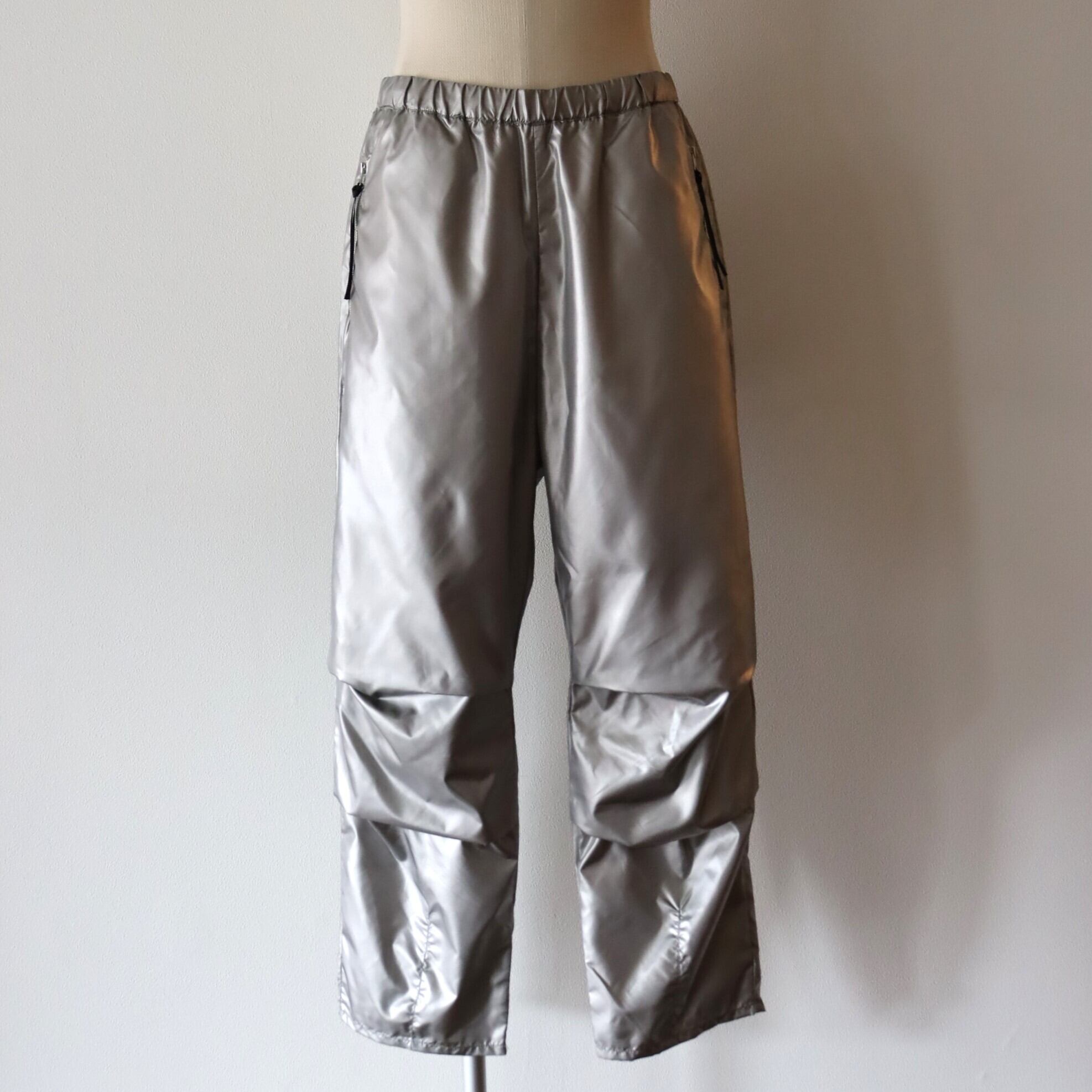 表地にはポリエステルリップストップにチタンコーティングを施し、近未来観を演出。裾はボタンにより絞って着用できるようになっております。