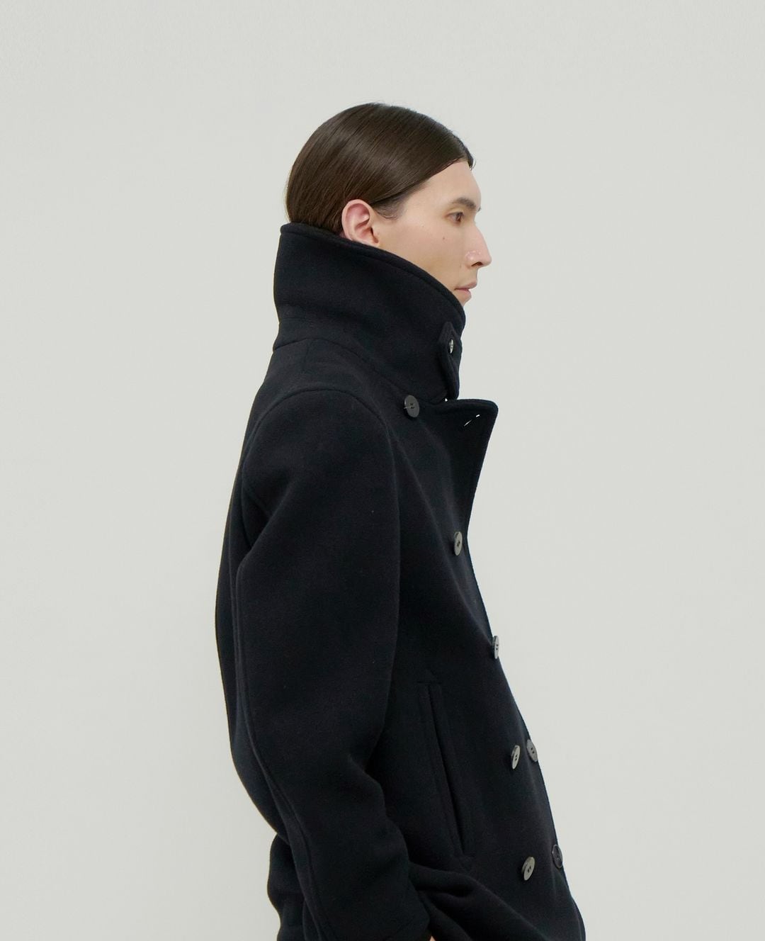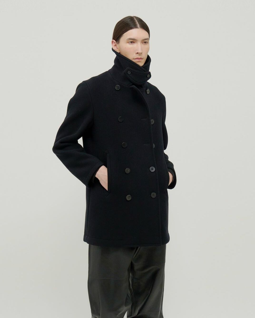 風向きに合わせて左右どちらの襟も上前にできるリーファーカラーと呼ばれる幅広のダブル襟を筆頭に、ハンドウオーマーポケット、2列に5つのボタンを配列した10ボタン、太腿あたりまでのハーフ丈などのPコートの基本ディティールはそのままに、通常使用されるような厚くて非常に重たいヘビーメルトンではなく、上質なウールで丁寧に織られたウールモッサを使用し、非常に軽くて暖かく、滑らかで上品な質感の表情に仕上げている。