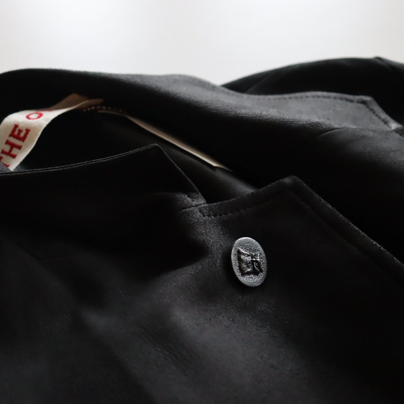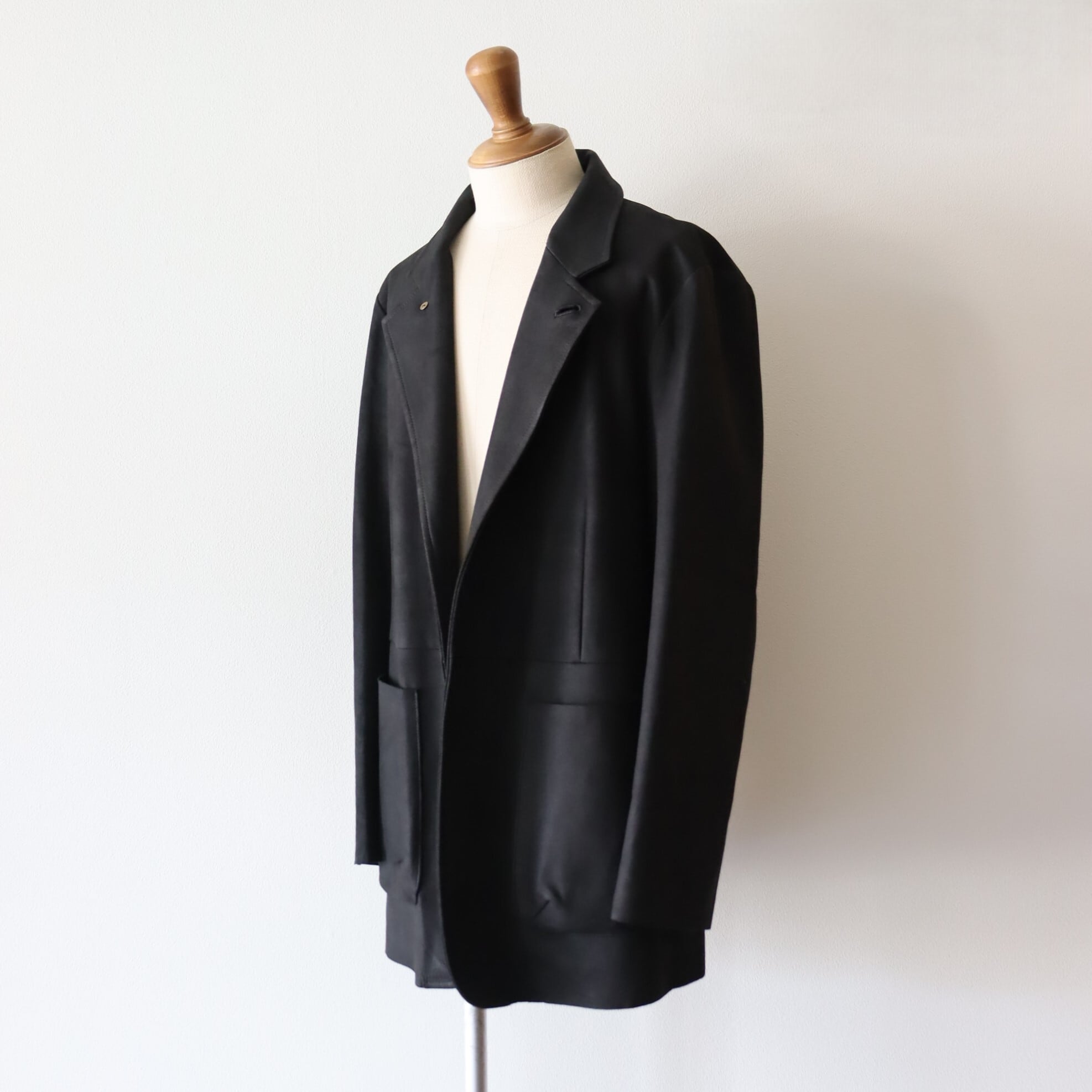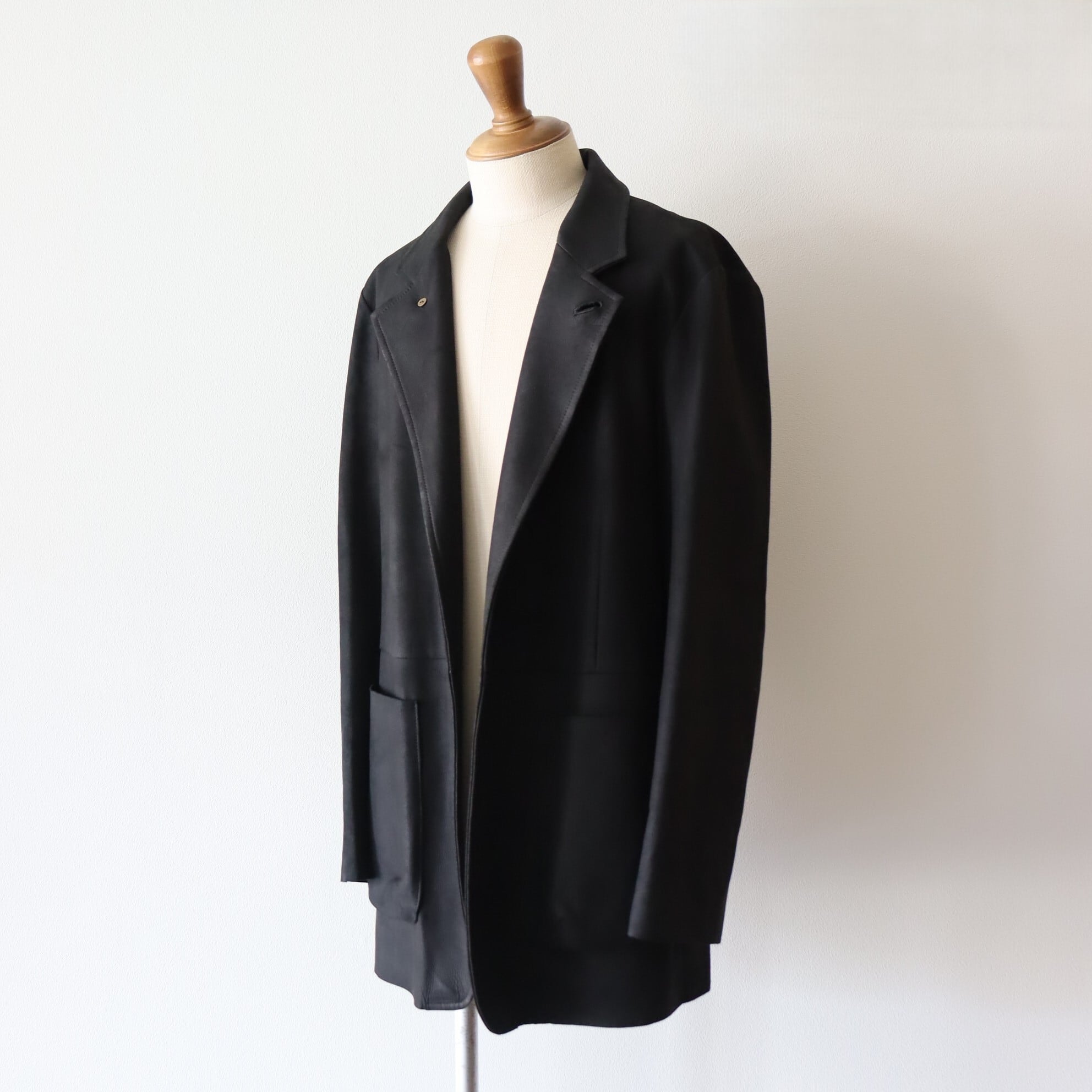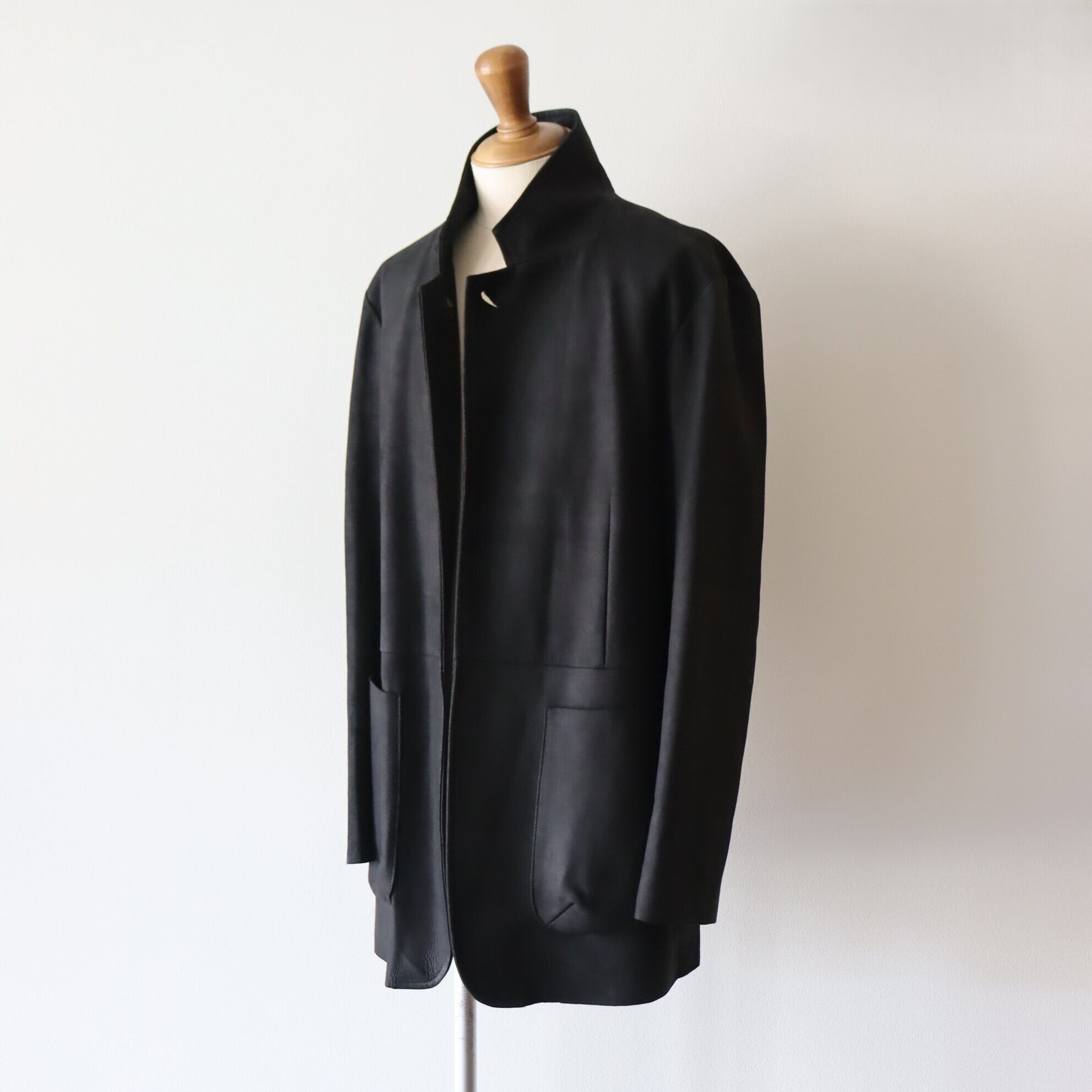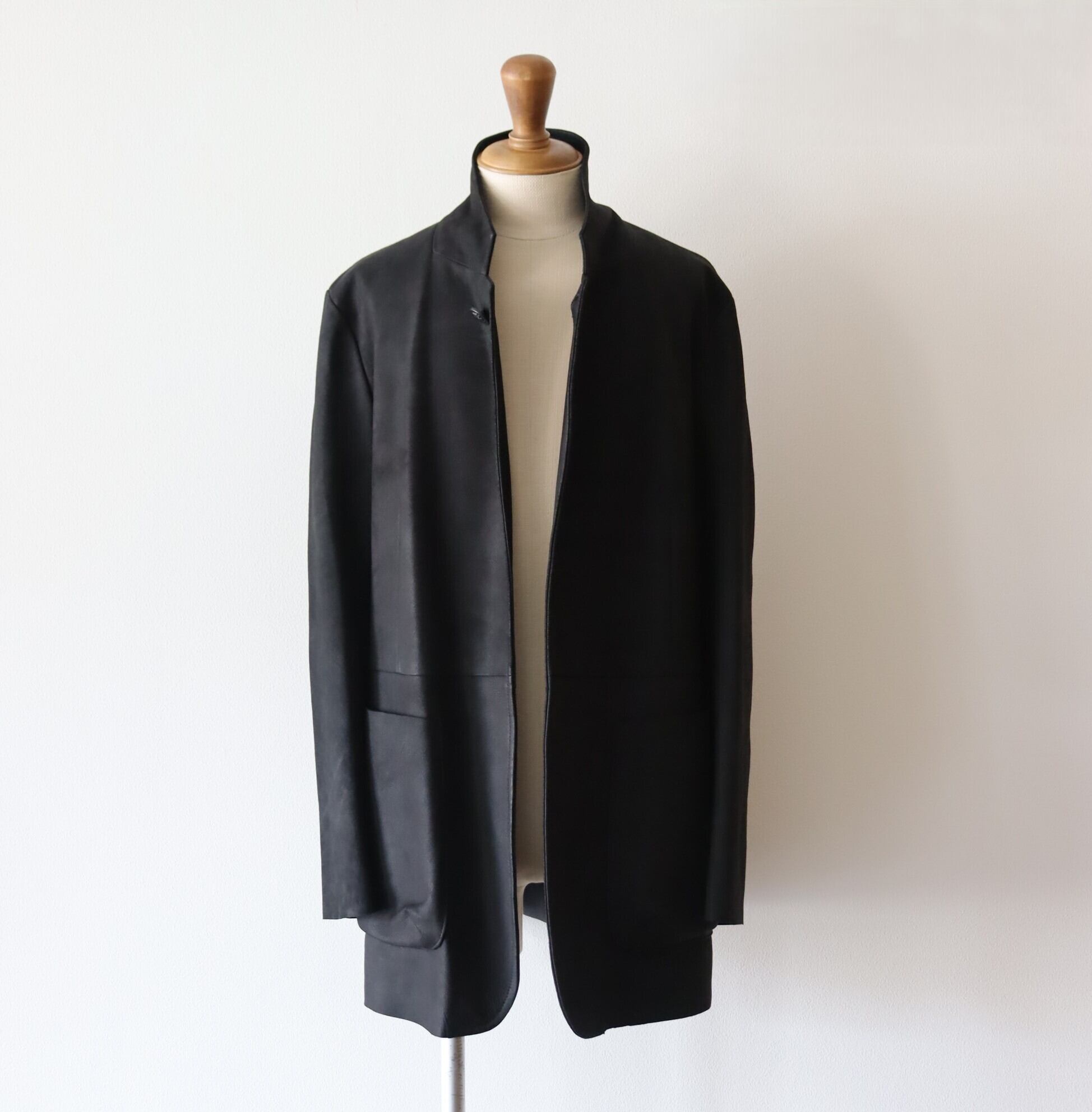 マットな表情を出すためにスゥエード面にナッパラン加工を施し両面銀面に施しており、加工を加えたスゥエード面を表に使用しております。ナッパラン加工を加え生まれた独特なマットな表情が、非常に雰囲気のある1着に昇華させています。また、本来表にくる銀面が裏にくることで、袖通しも非常によいものとなっております。