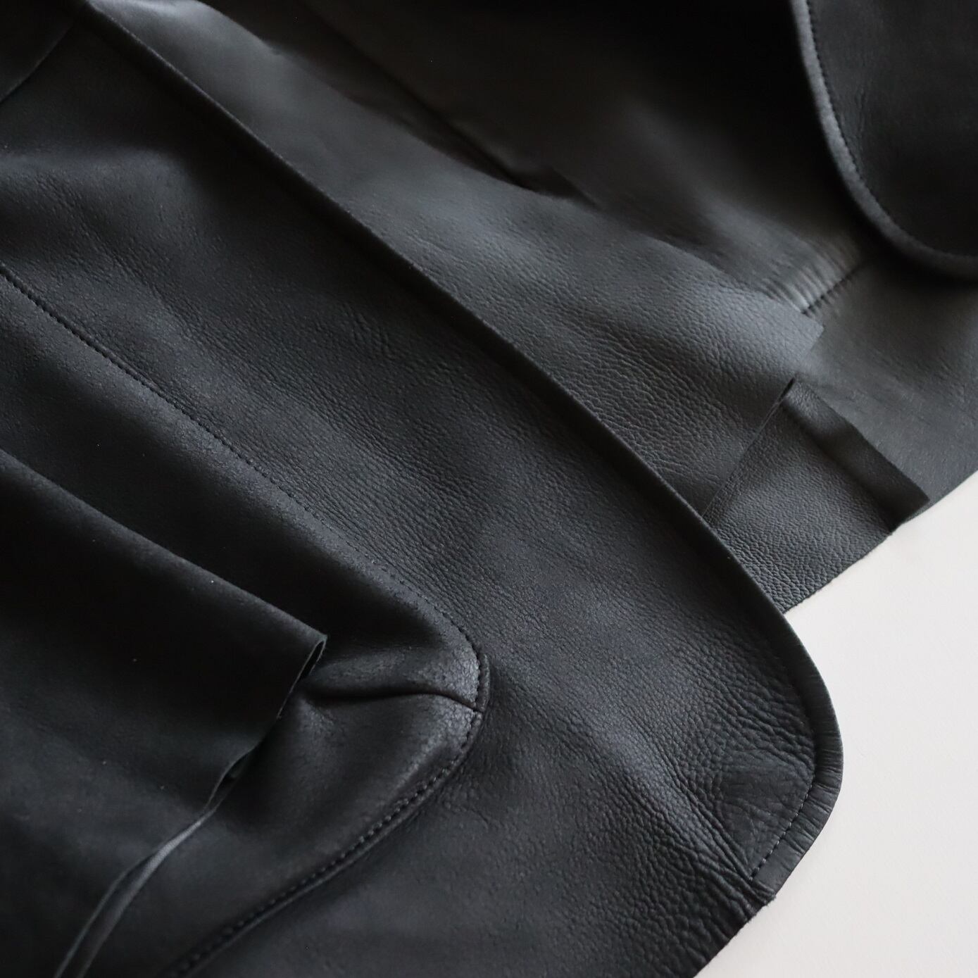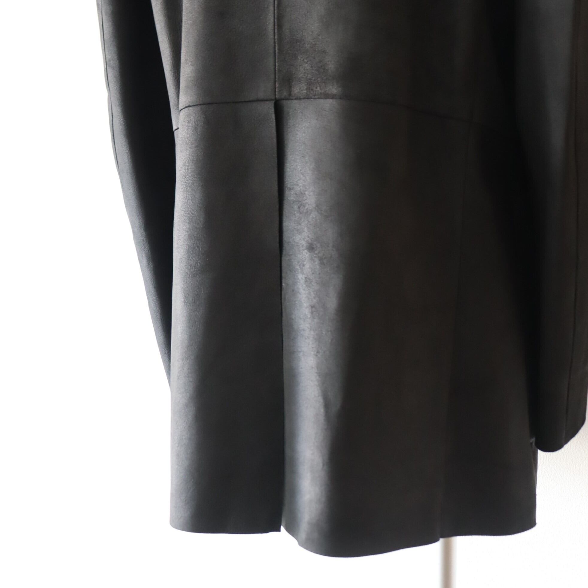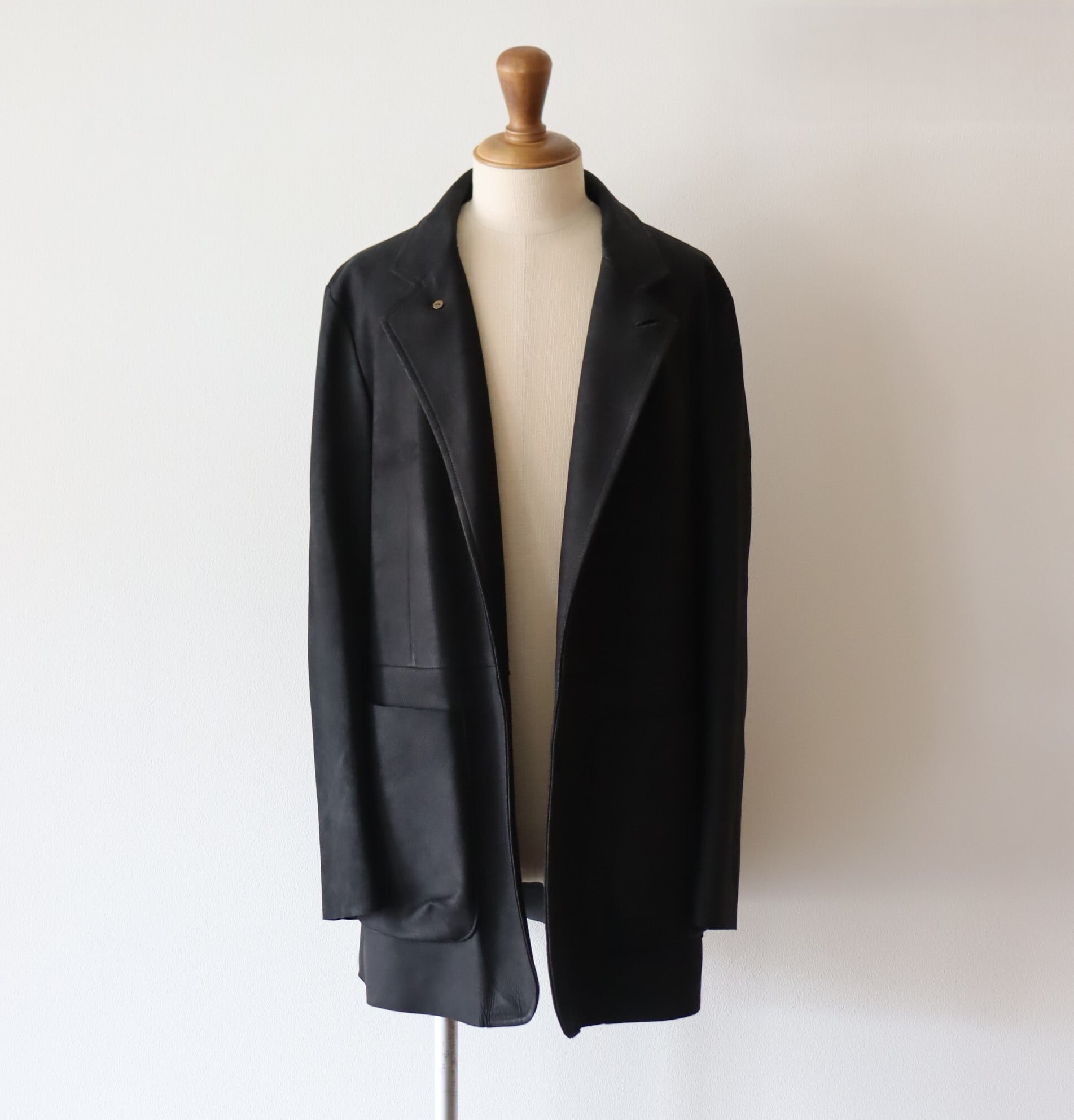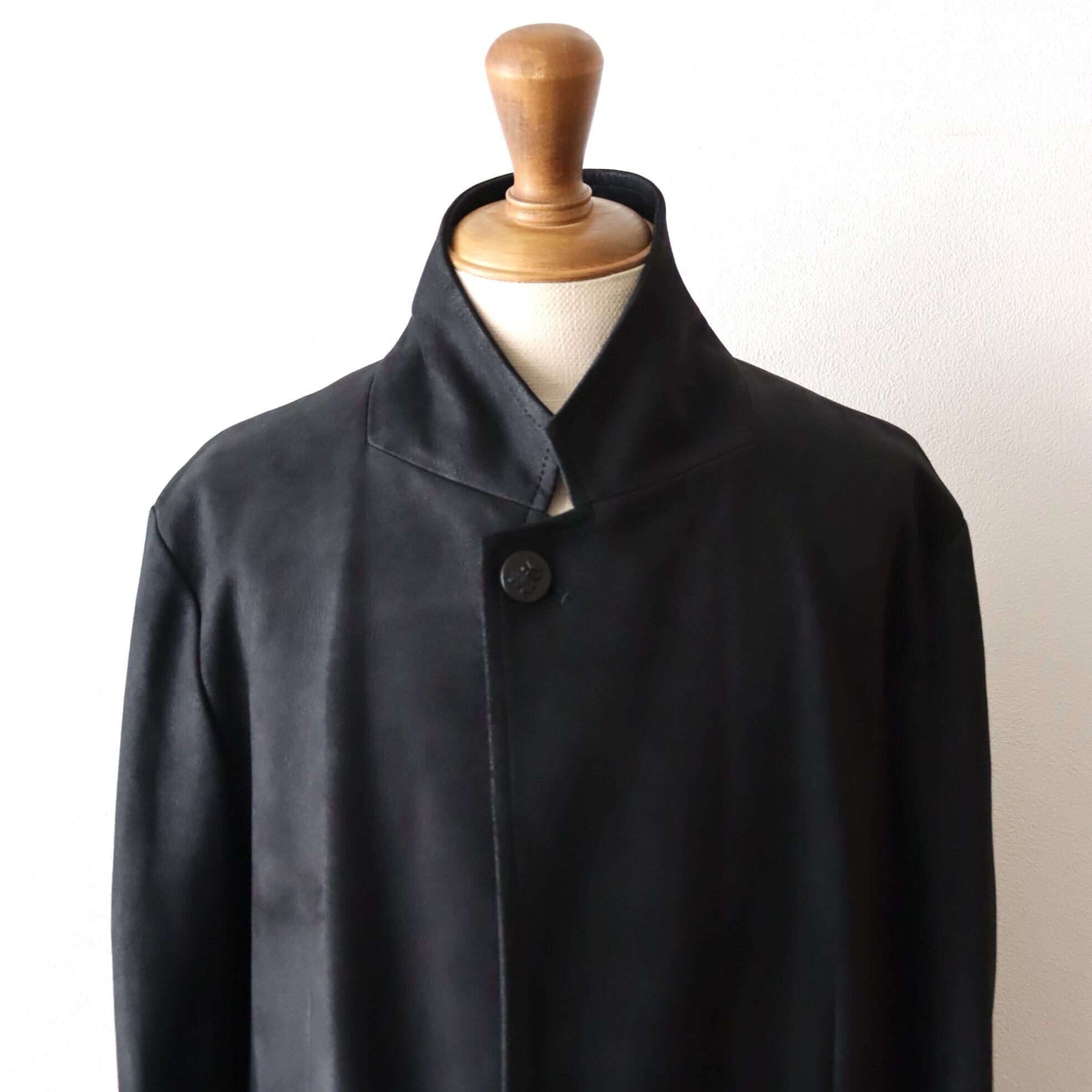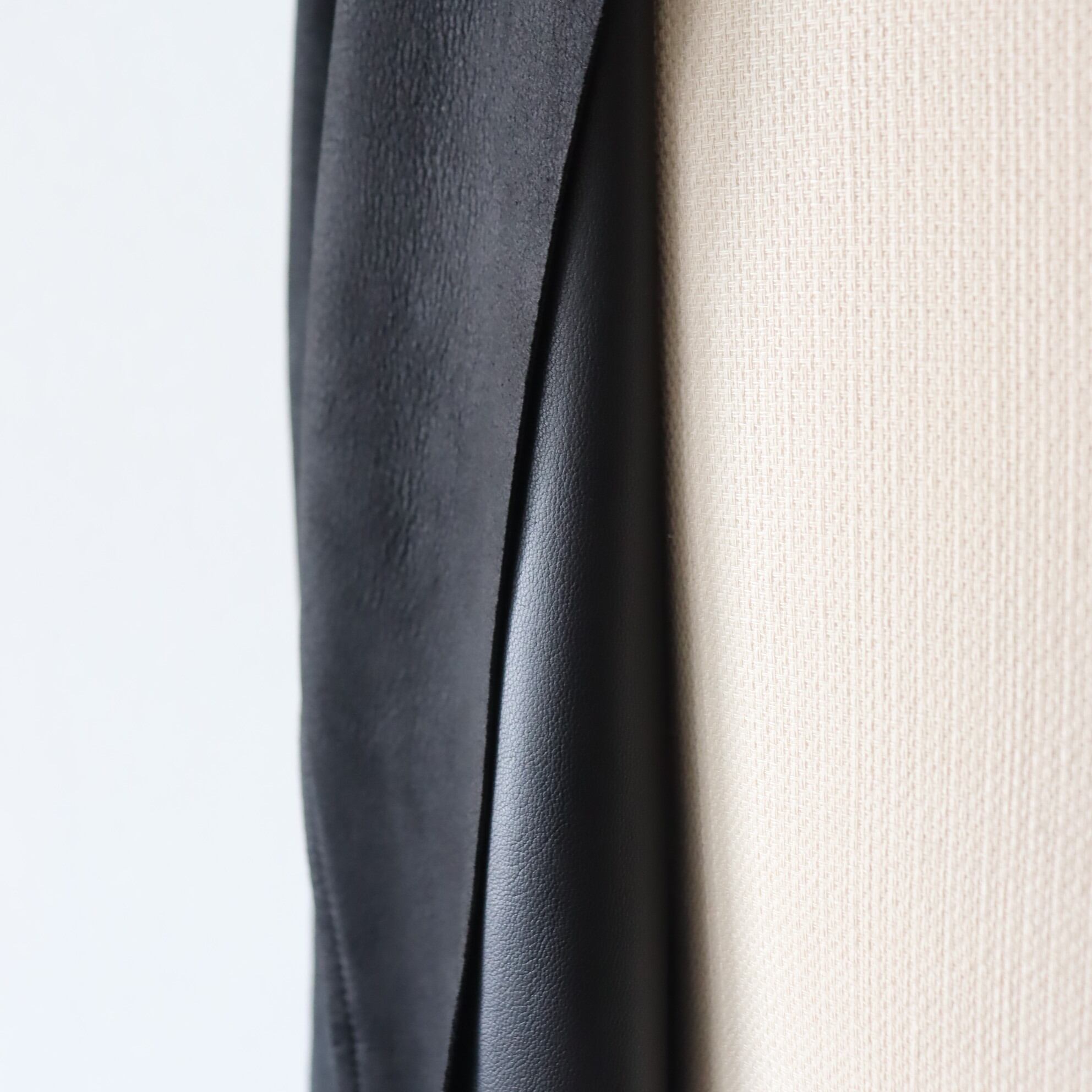 マットな表情を出すためにスゥエード面にナッパラン加工を施し両面銀面に施しており、加工を加えたスゥエード面を表に使用しております。ナッパラン加工を加え生まれた独特なマットな表情が、非常に雰囲気のある1着に昇華させています。また、本来表にくる銀面が裏にくることで、袖通しも非常によいものとなっております。