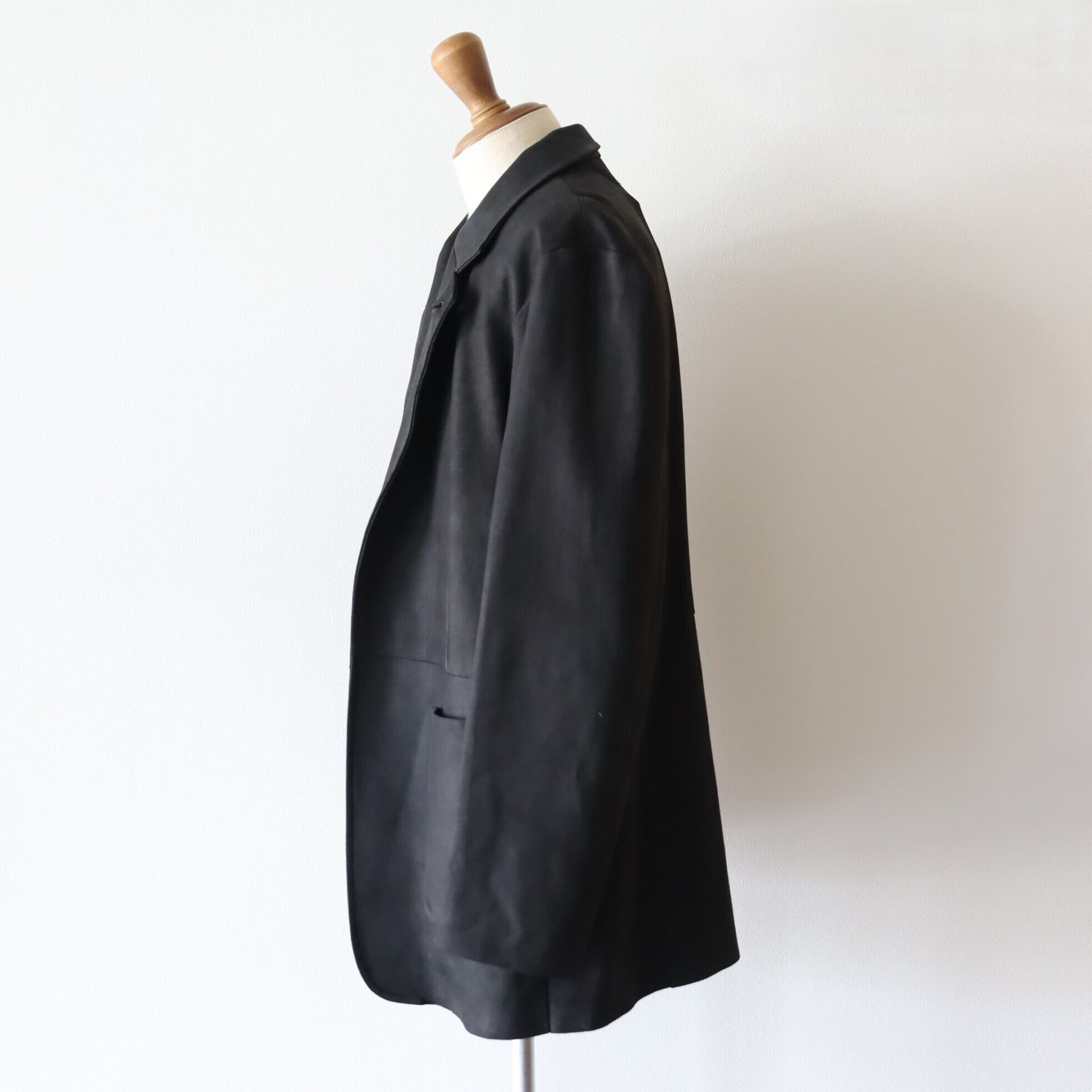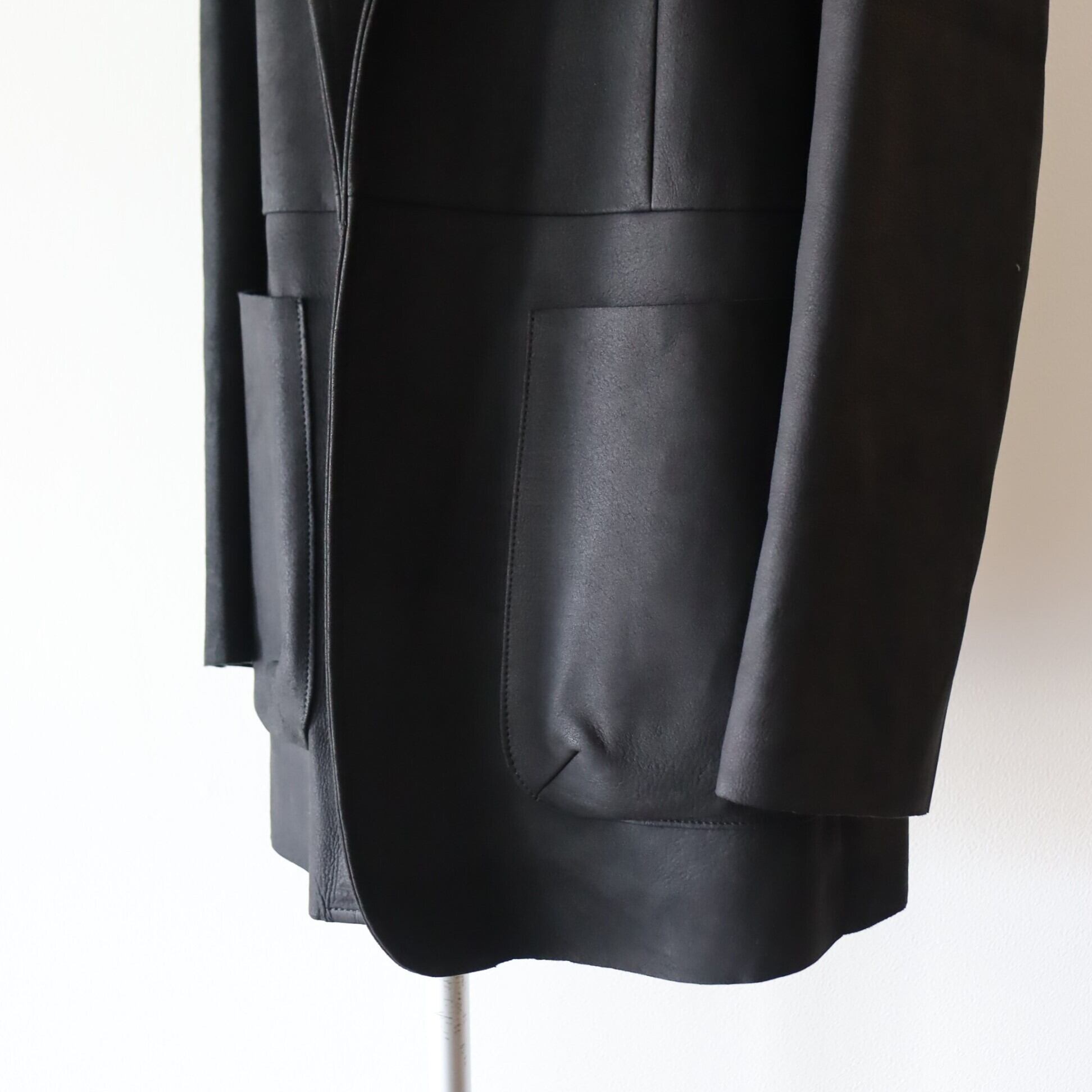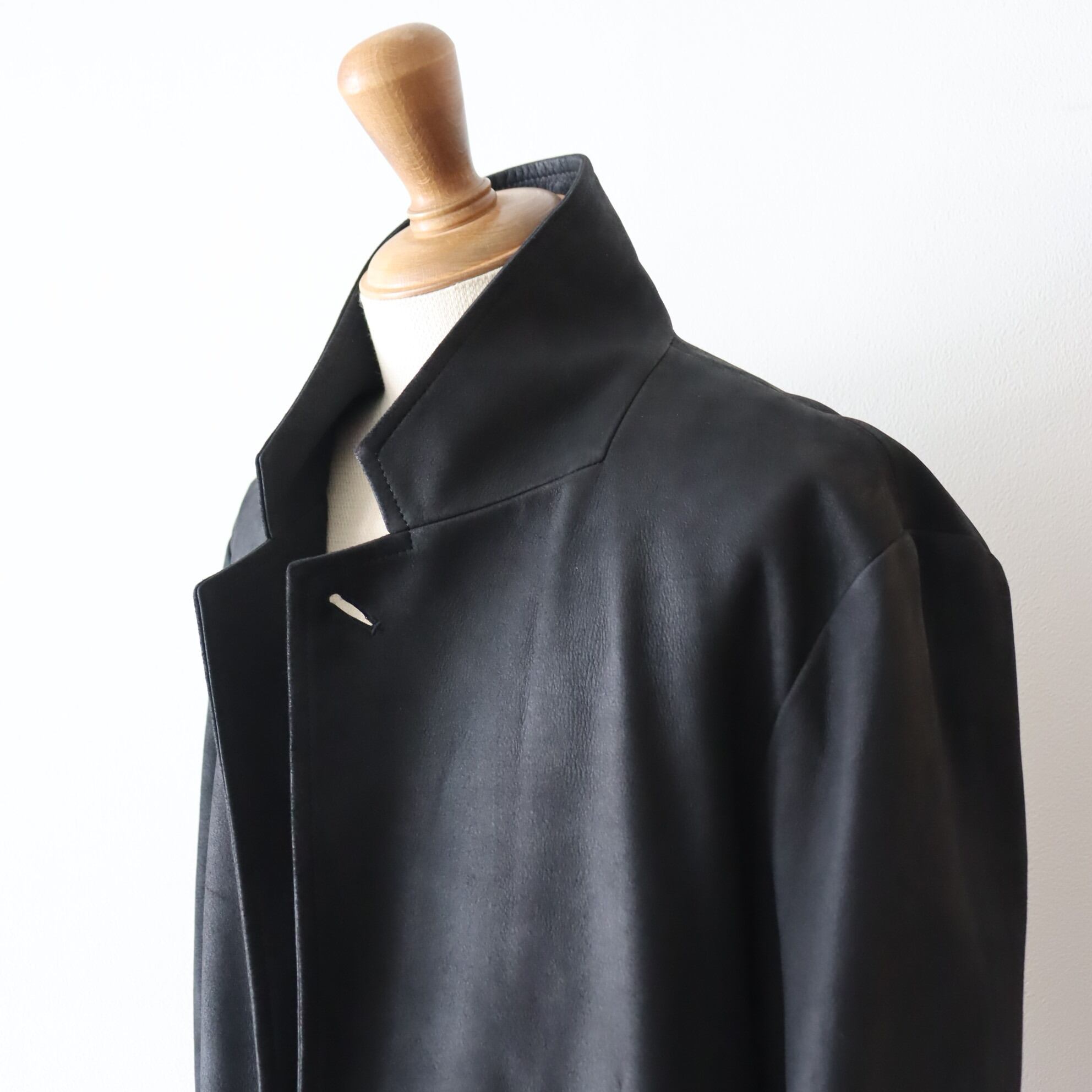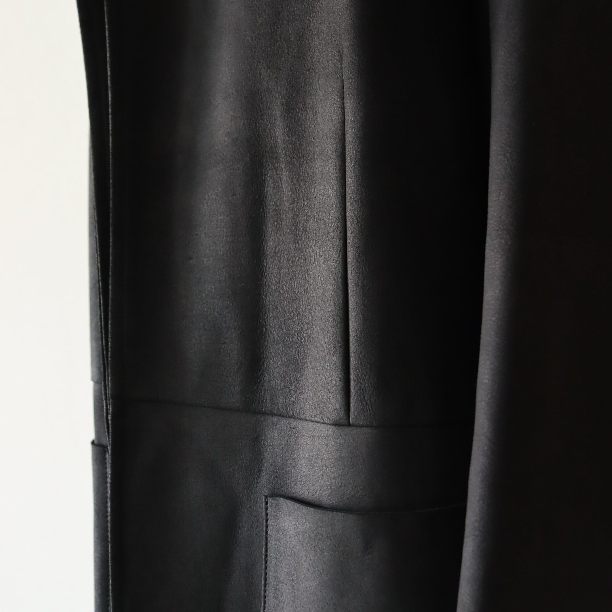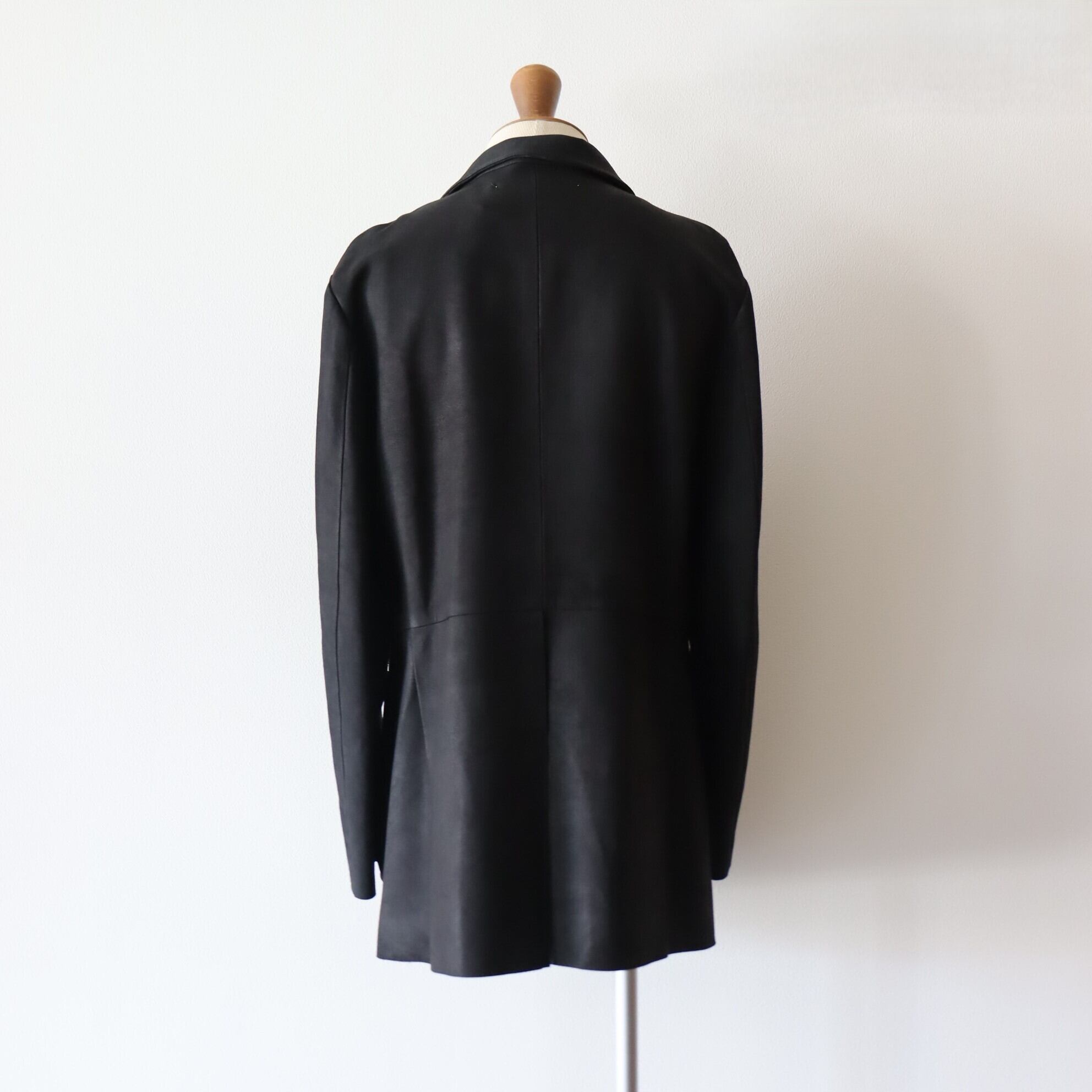 マットな表情を出すためにスゥエード面にナッパラン加工を施し両面銀面に施しており、加工を加えたスゥエード面を表に使用しております。ナッパラン加工を加え生まれた独特なマットな表情が、非常に雰囲気のある1着に昇華させています。また、本来表にくる銀面が裏にくることで、袖通しも非常によいものとなっております。