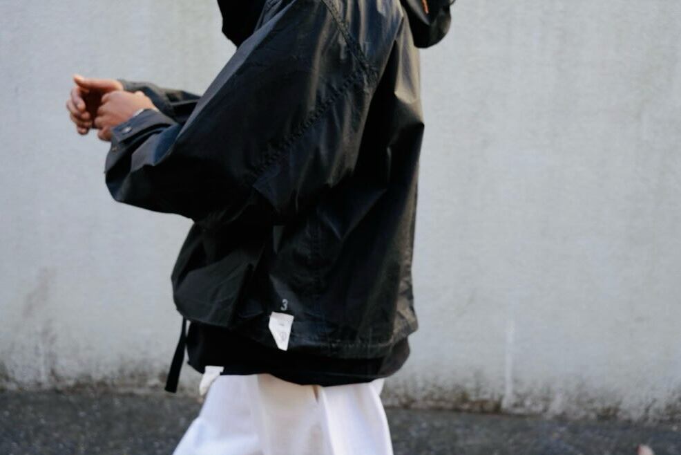 裾をギュッとブラウジングし、太めのパンツと合わせて頂けると非常によい雰囲気を醸し出してくれます。