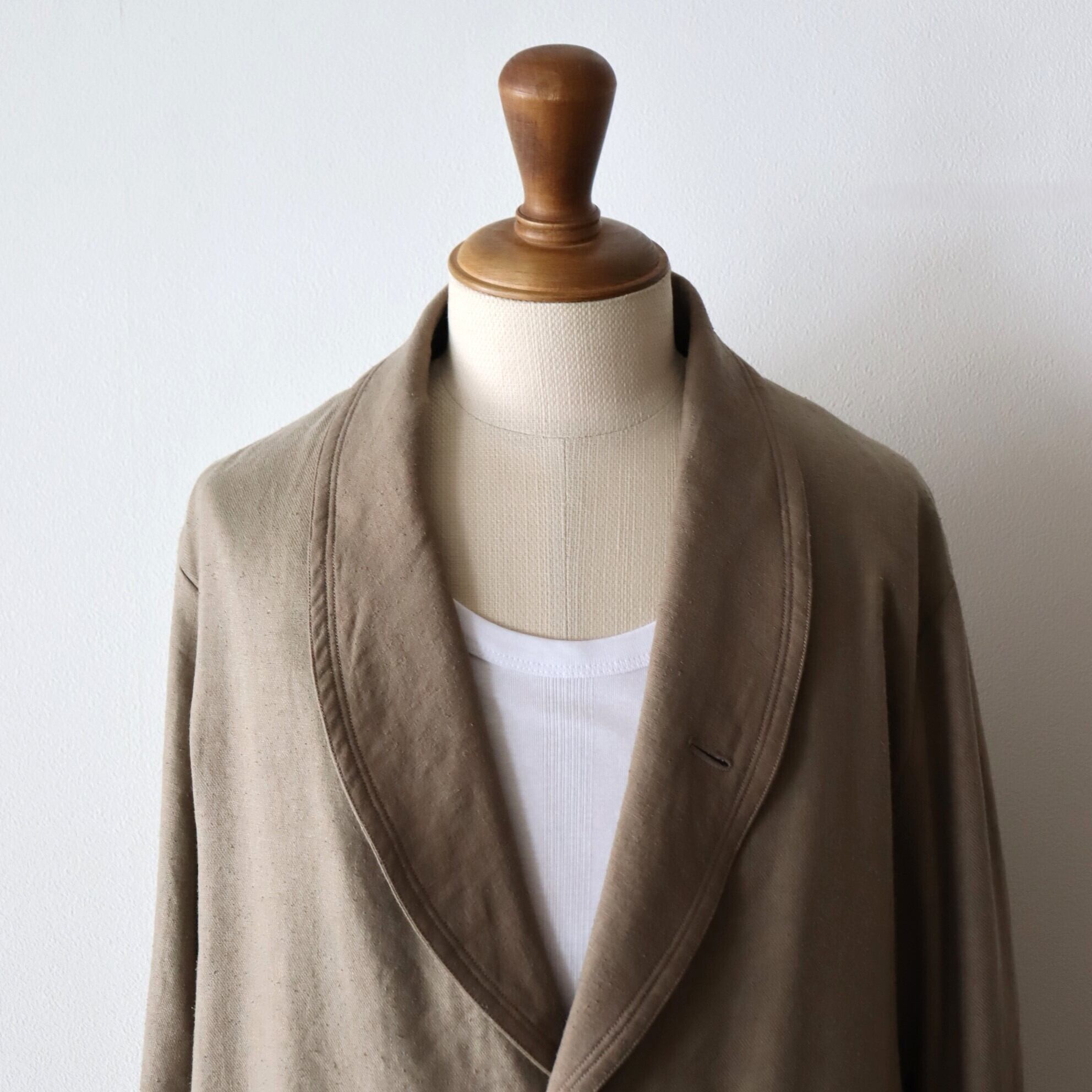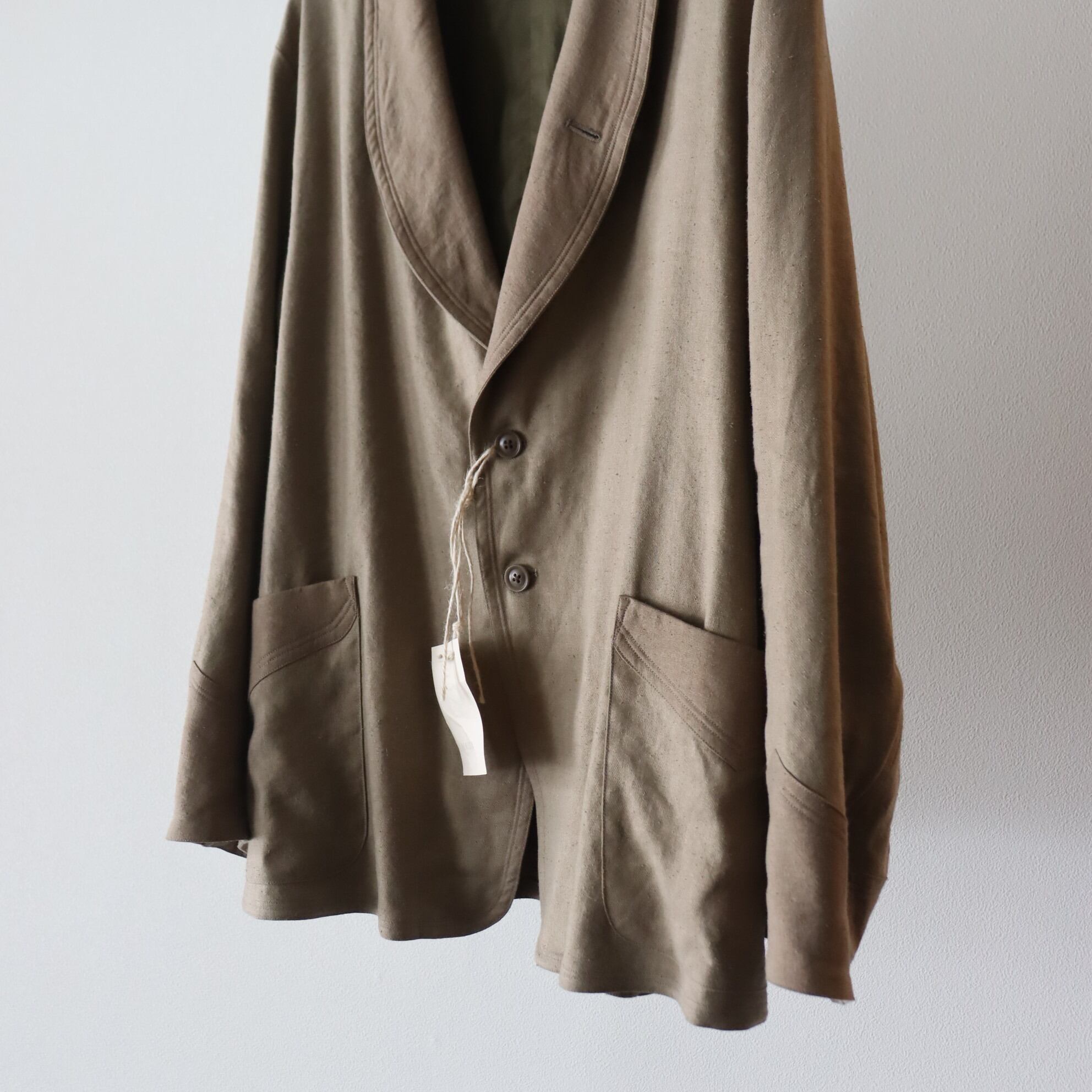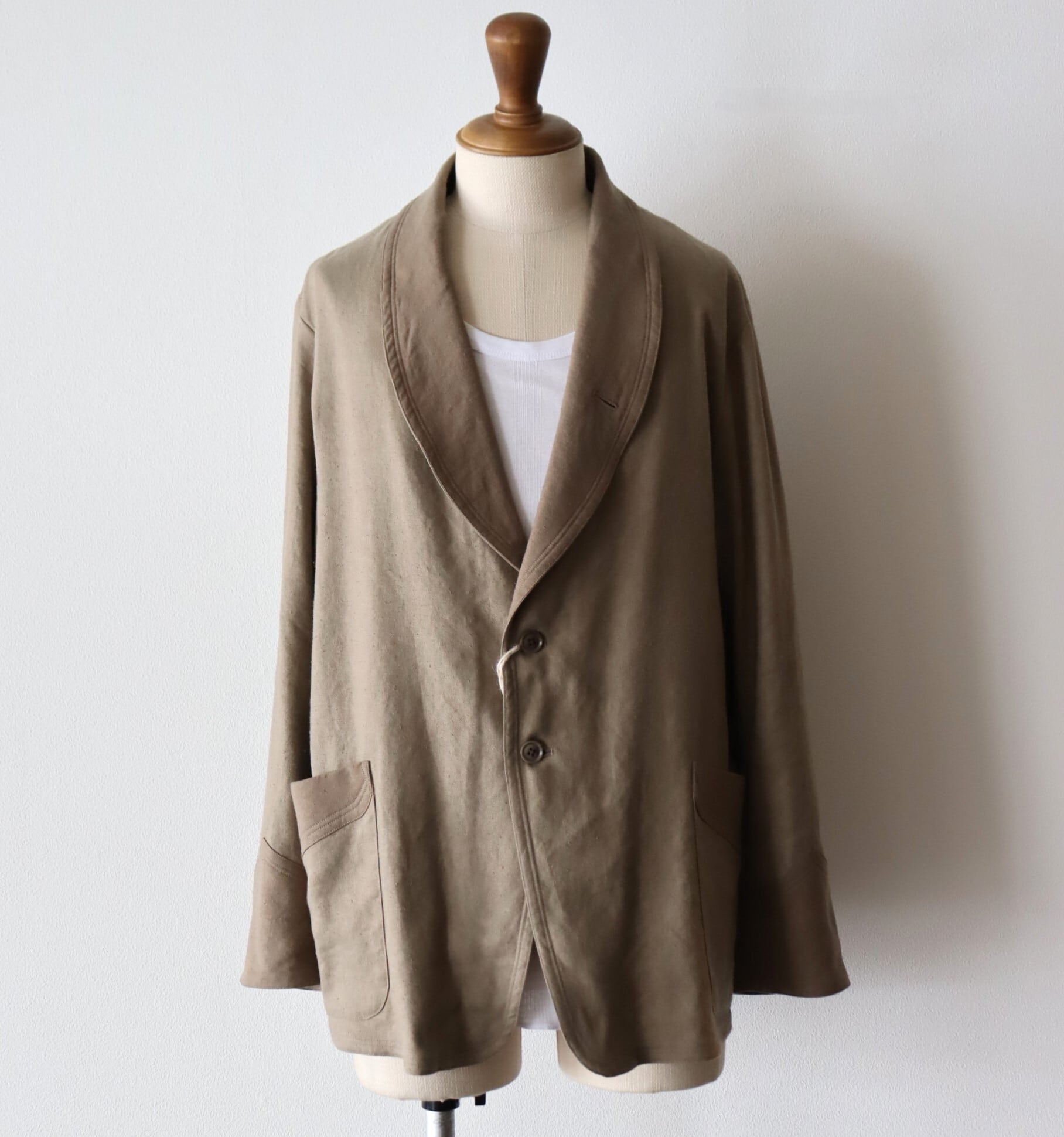 煙草の灰から衣服を守るために着用された、タキシードの原型になったとも言われるスモーキングジャケットをベースに、エドワーディアンジャケットのエッセンスを取り入れたジャケット。