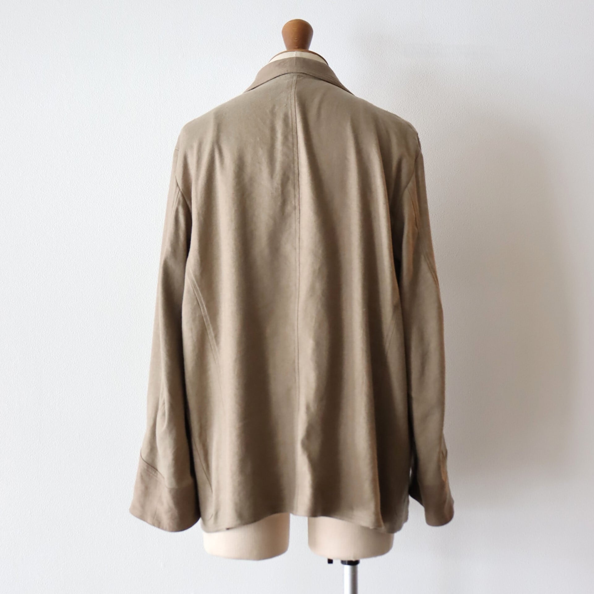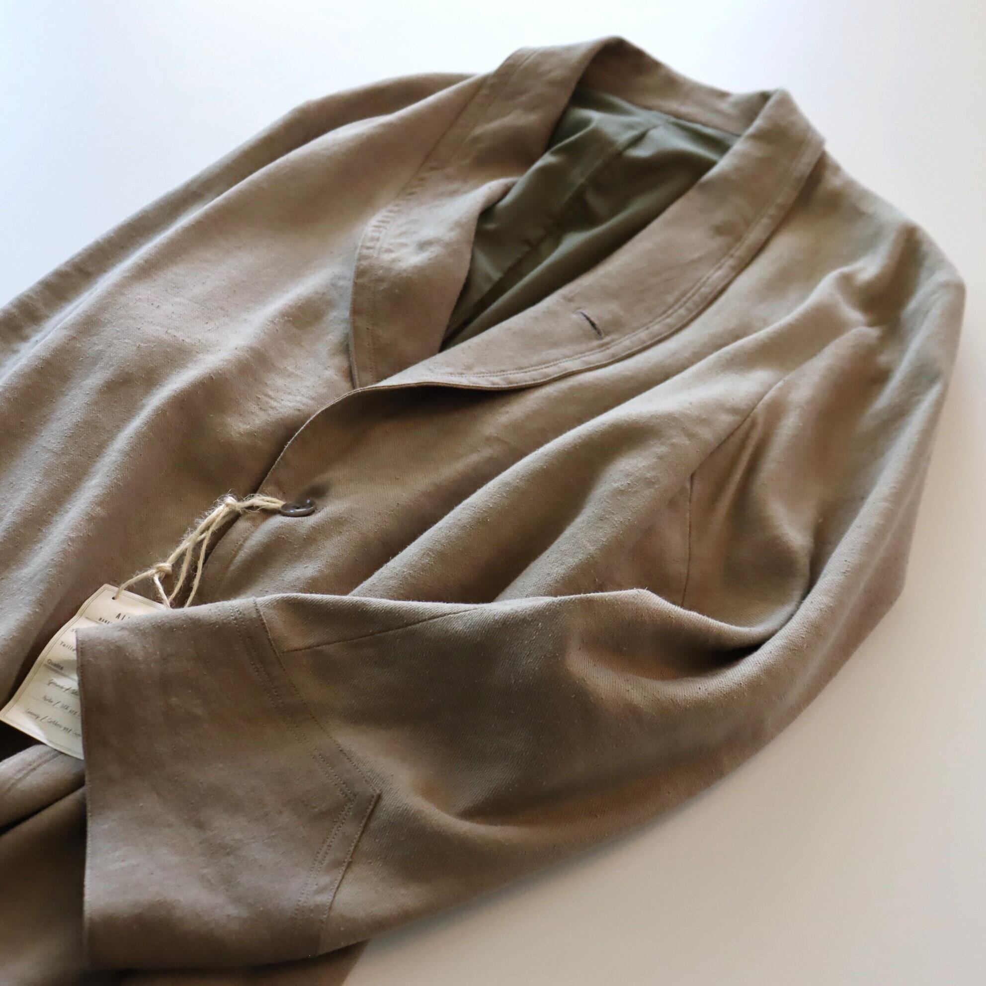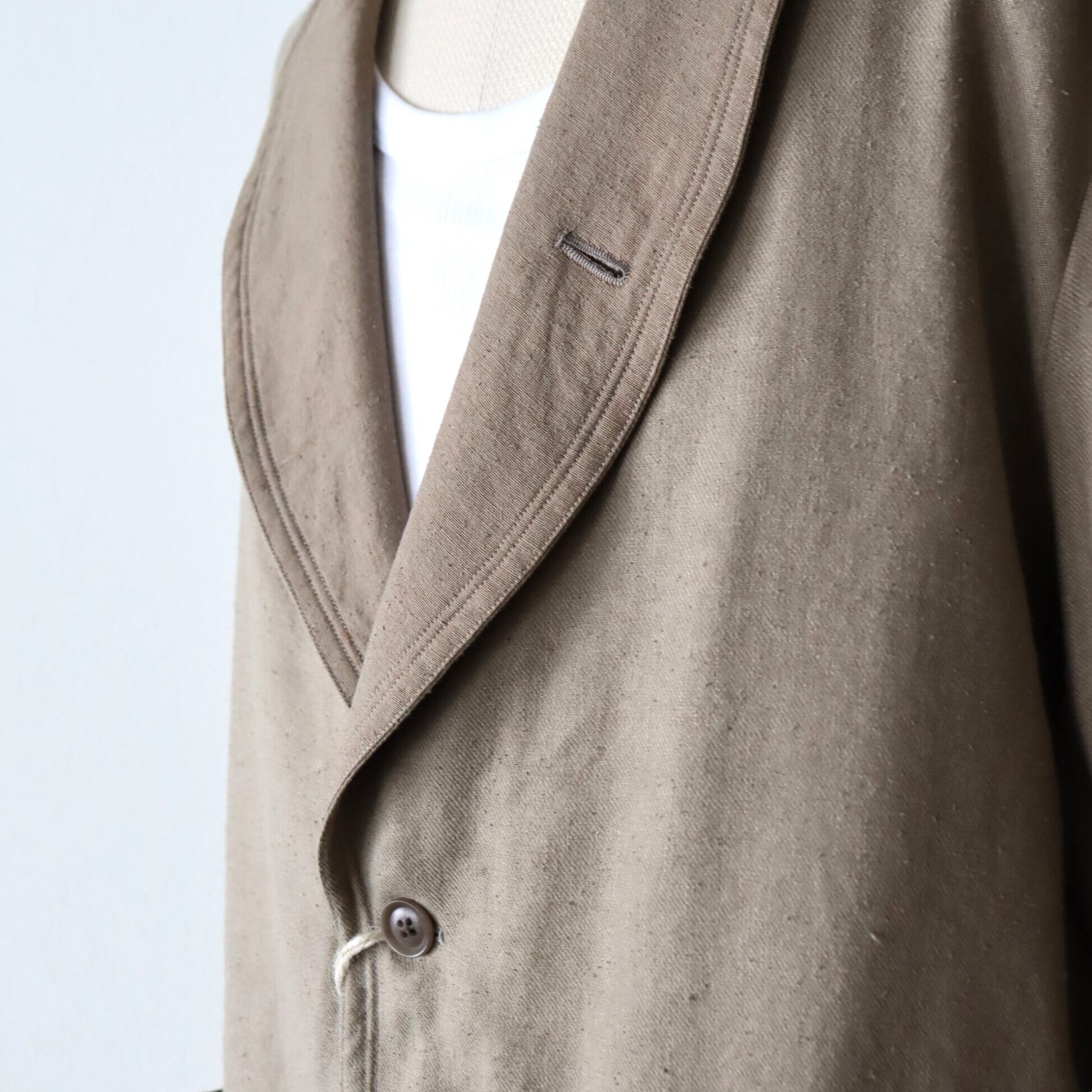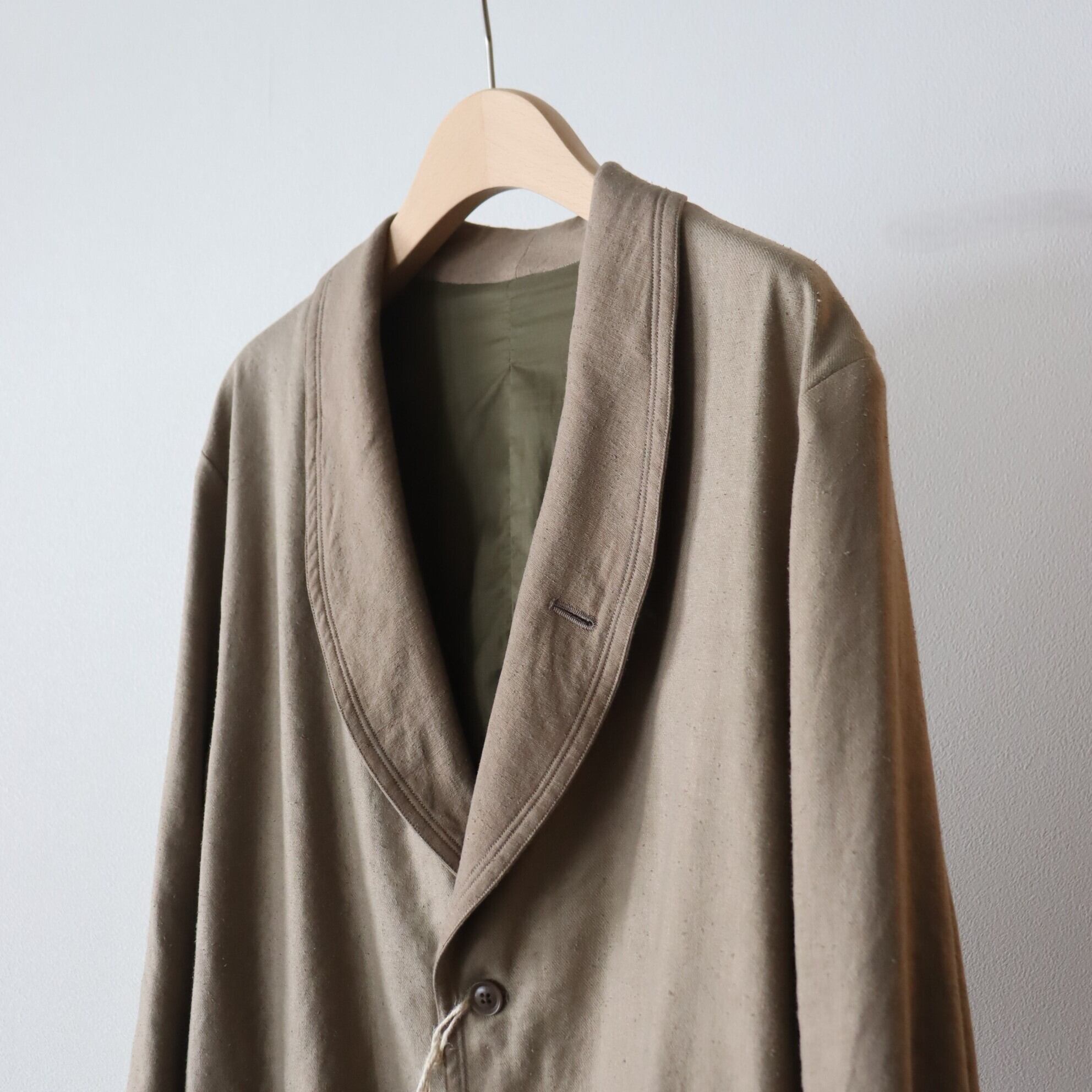 煙草の灰から衣服を守るために着用された、タキシードの原型になったとも言われるスモーキングジャケットをベースに、エドワーディアンジャケットのエッセンスを取り入れたジャケット。