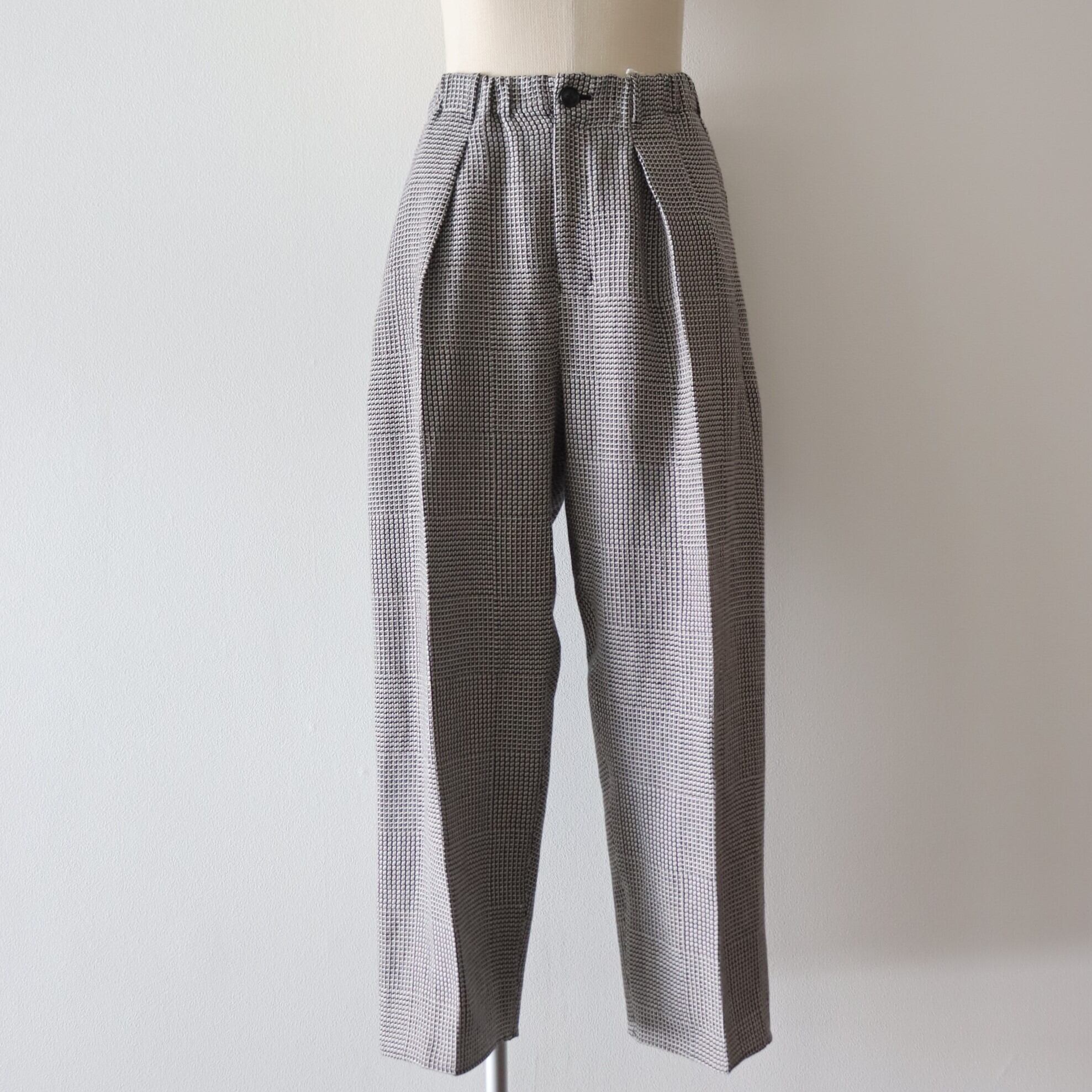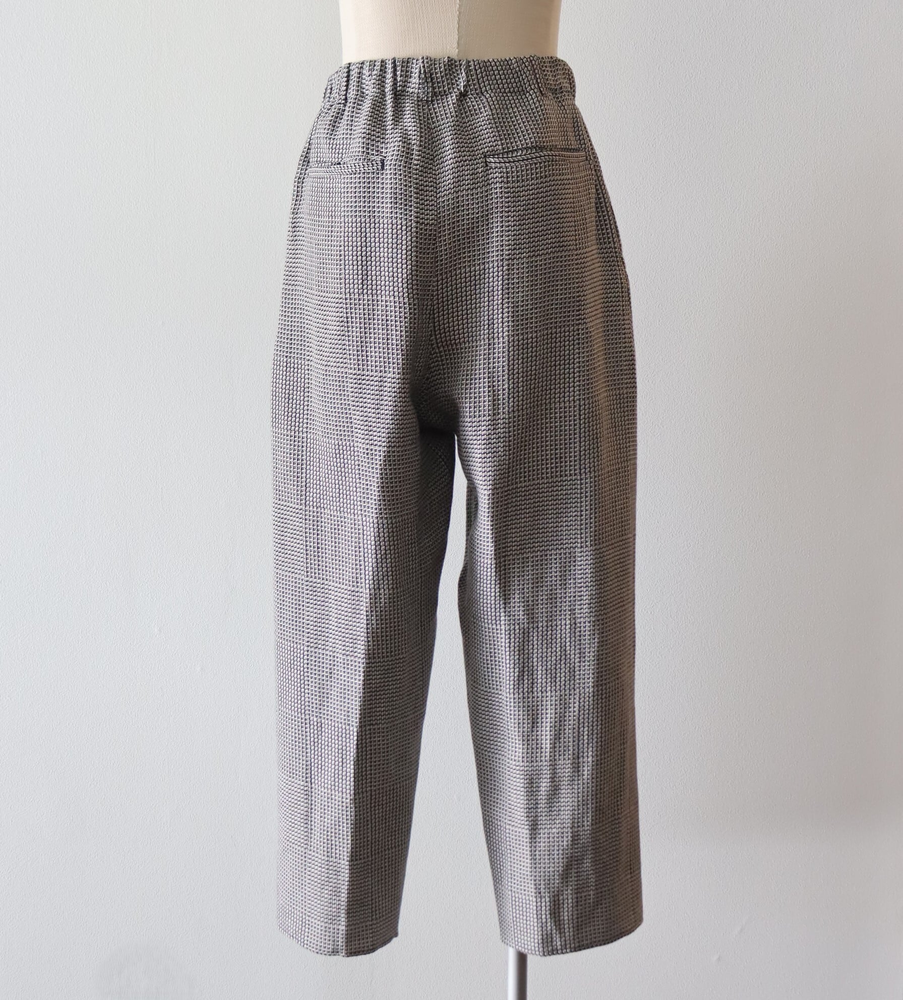 ウエストにエラスティックと肌側にスピンドルを施した、ワイドシルエットのストレートが基軸のややテーパードで、ラグジュアリーな贅沢なボリュームとシルエットのパンツ。