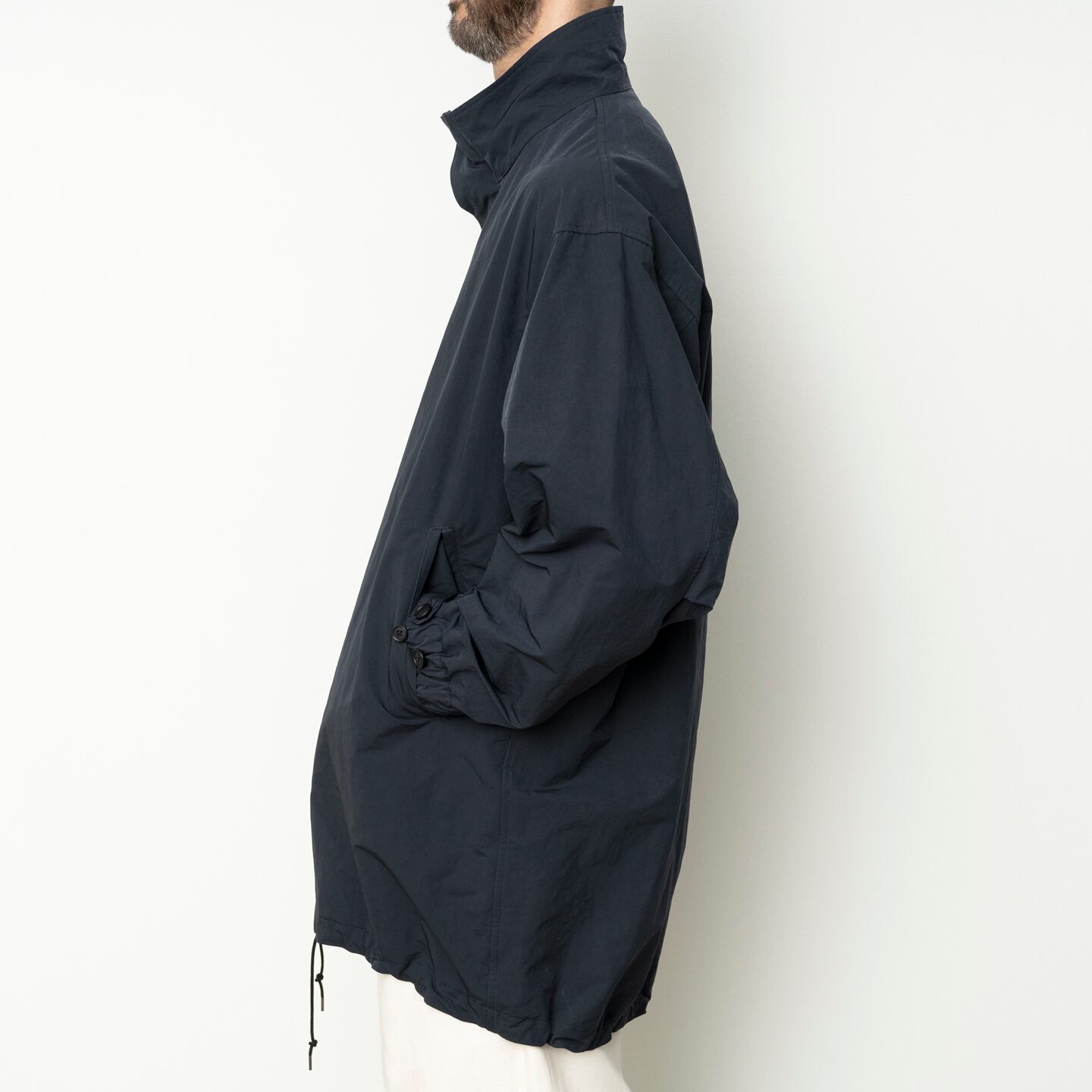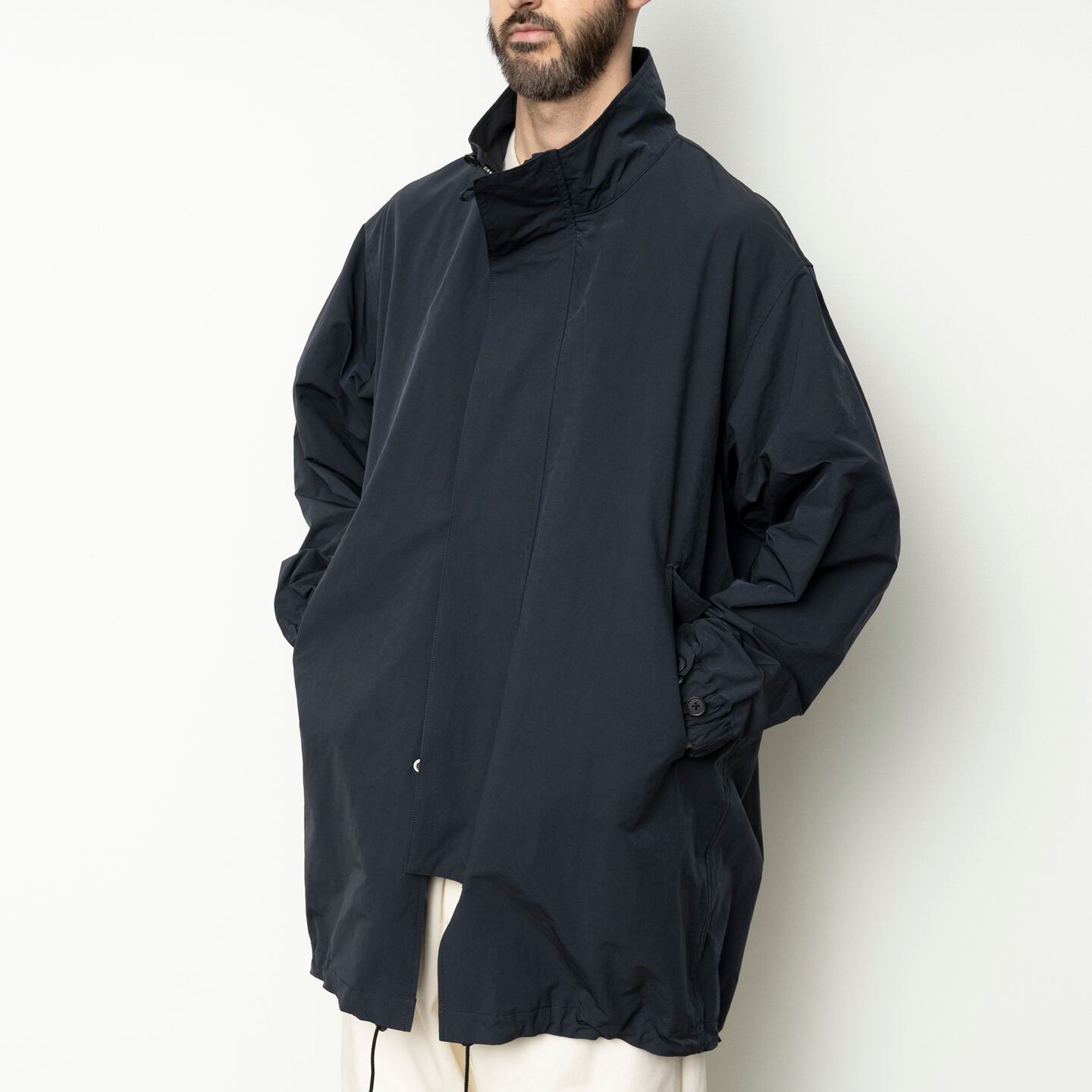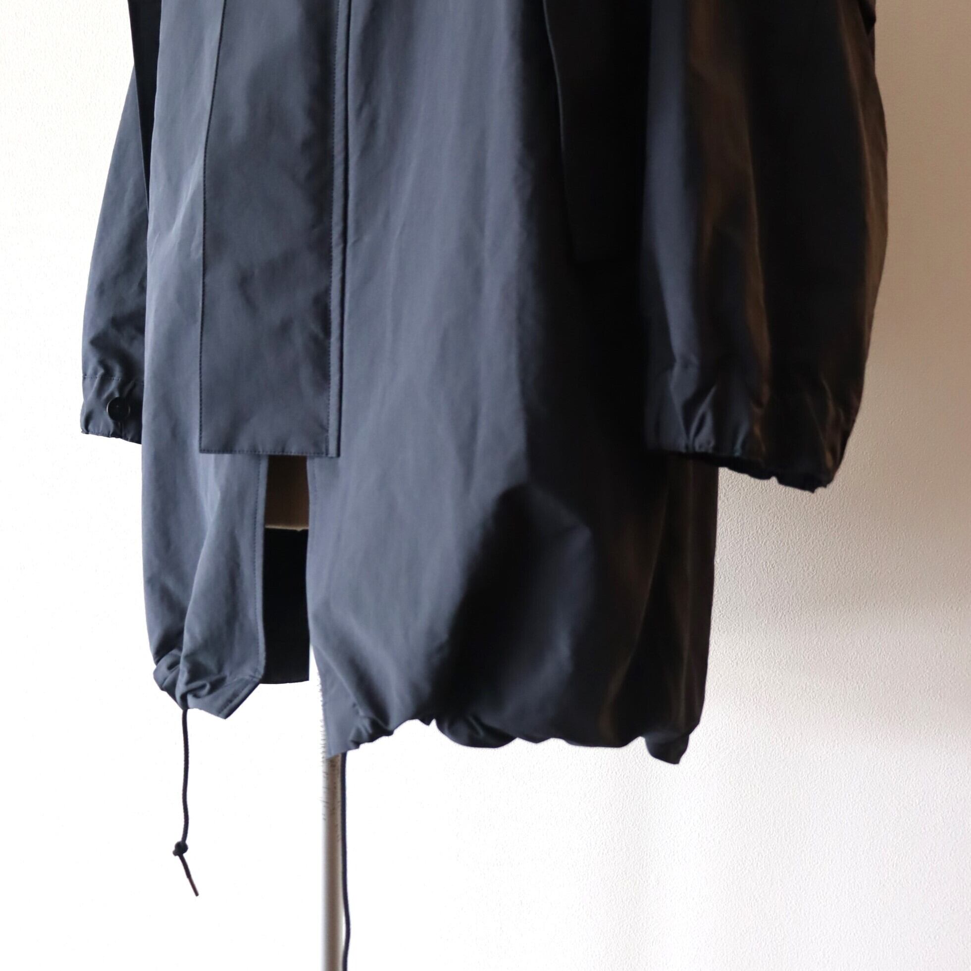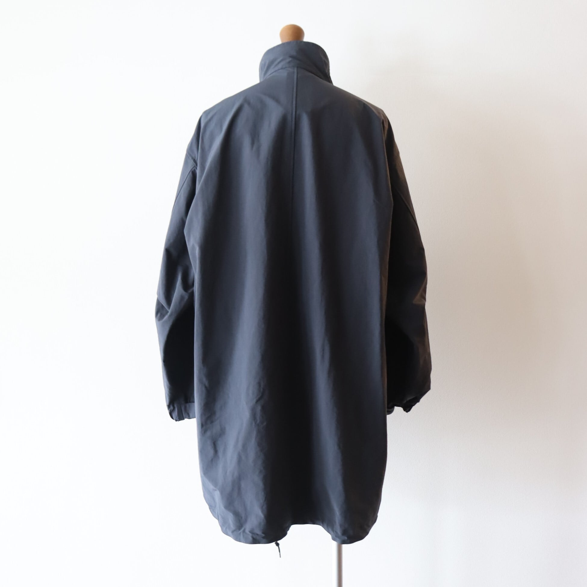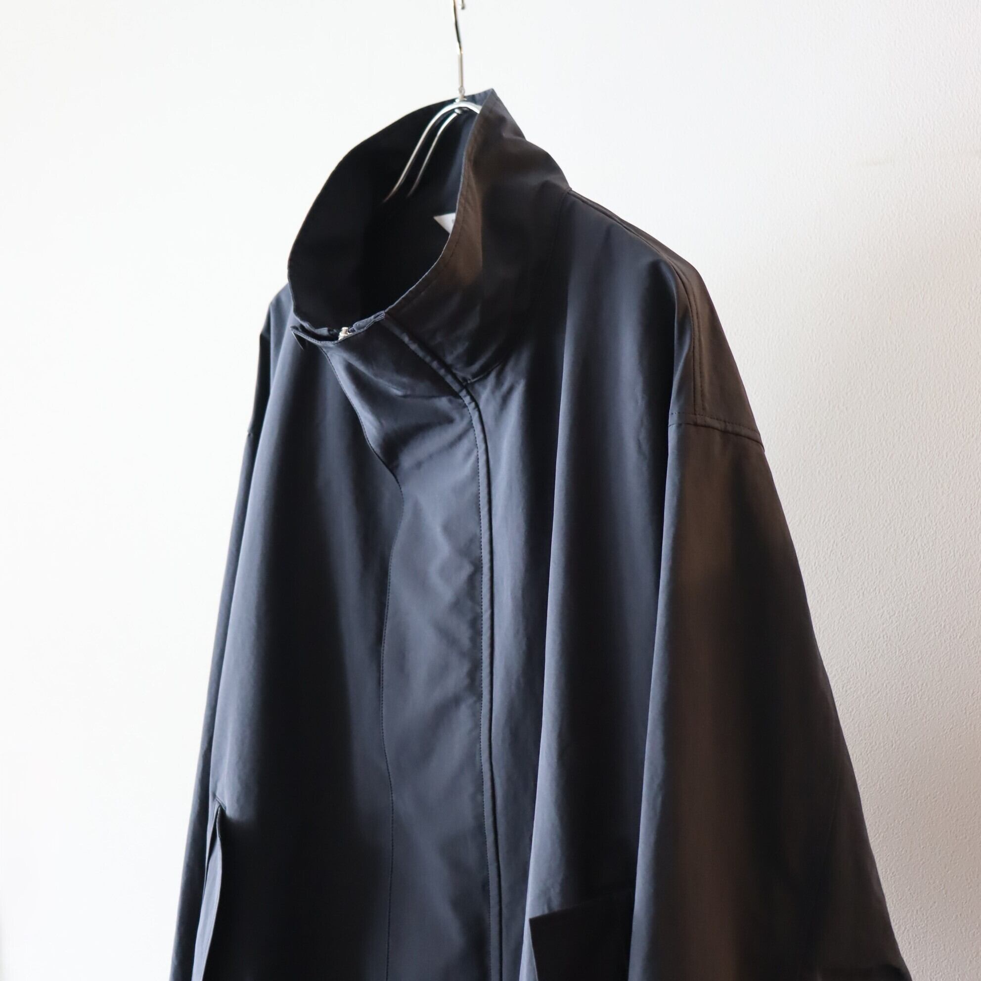 ポリエステルとナイロンの割繊糸の平織素材を使用したスタンドカラーコート。リラックスフィットのアイテムで撥水性もあり都会的なモッズコートのような仕上がりです。