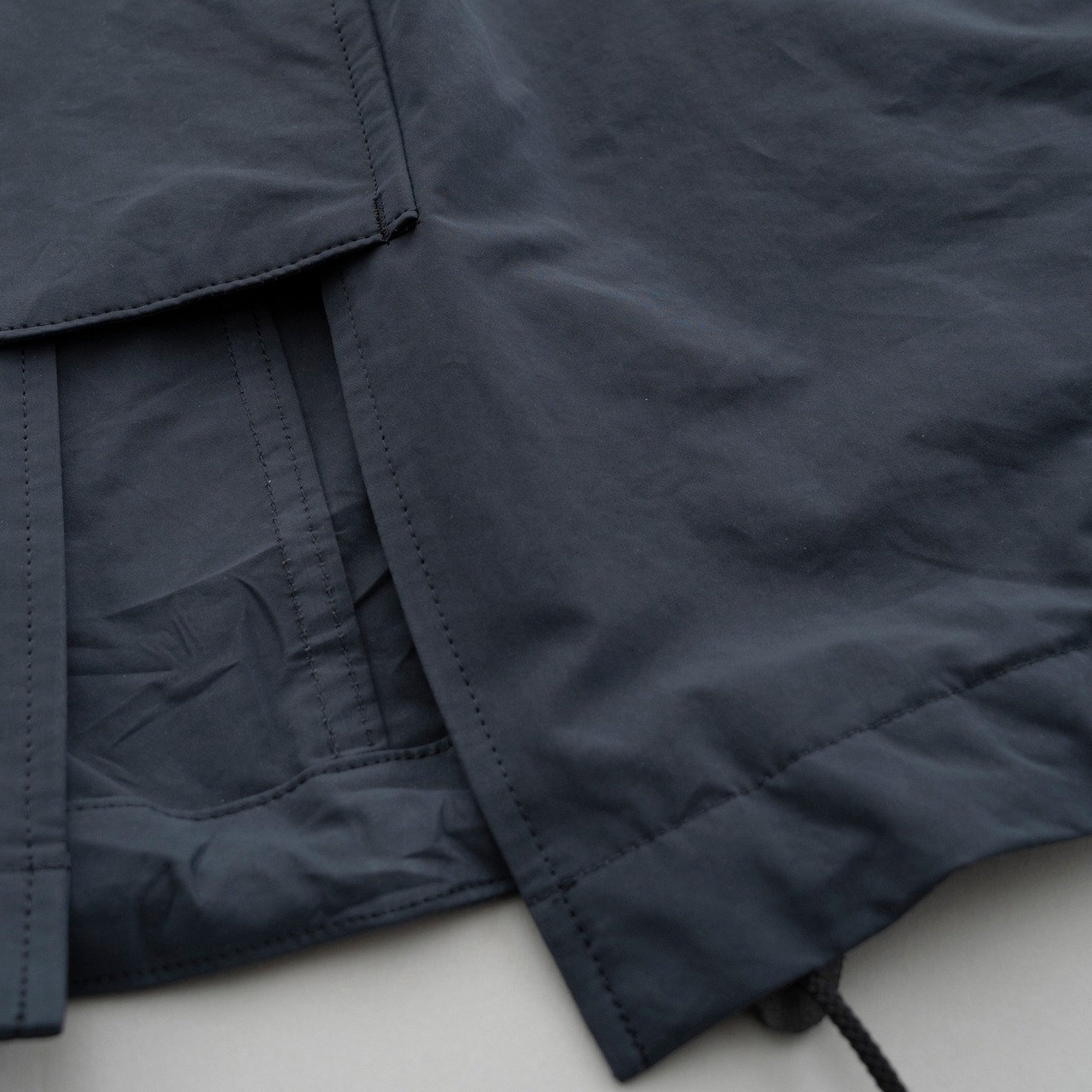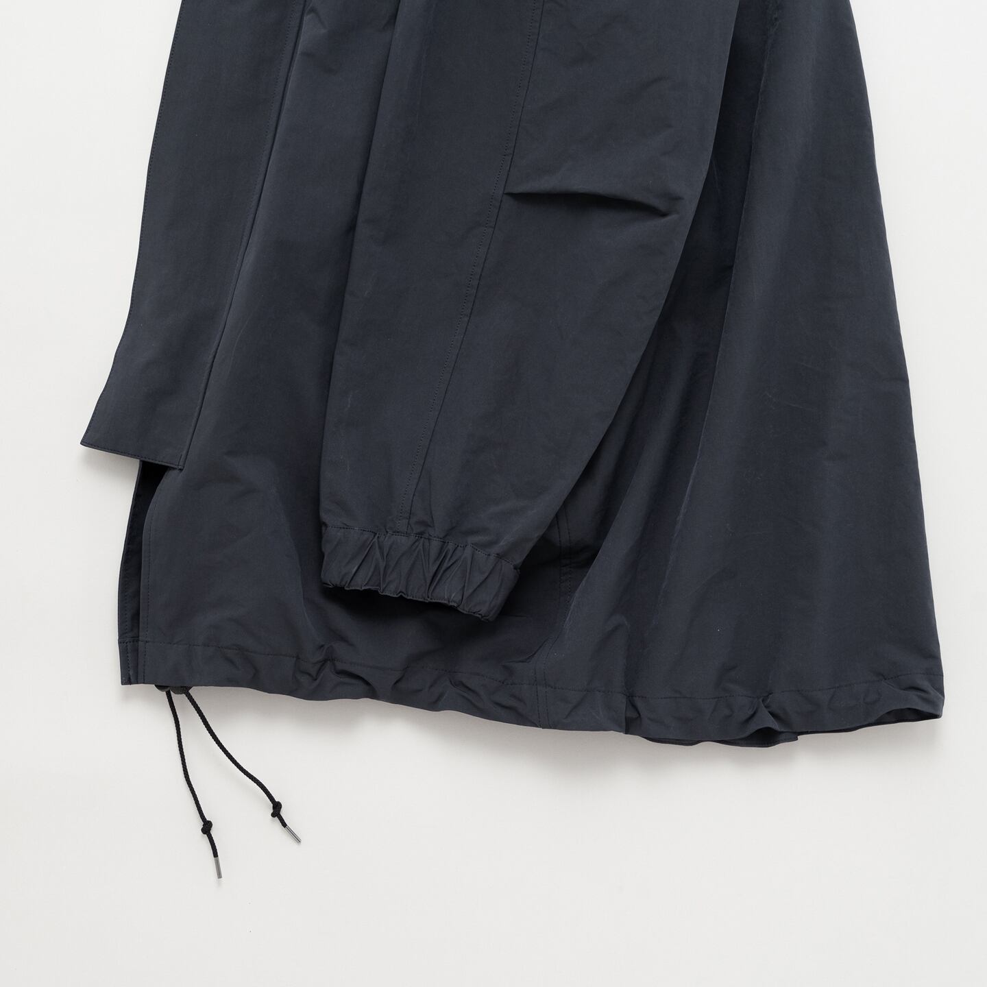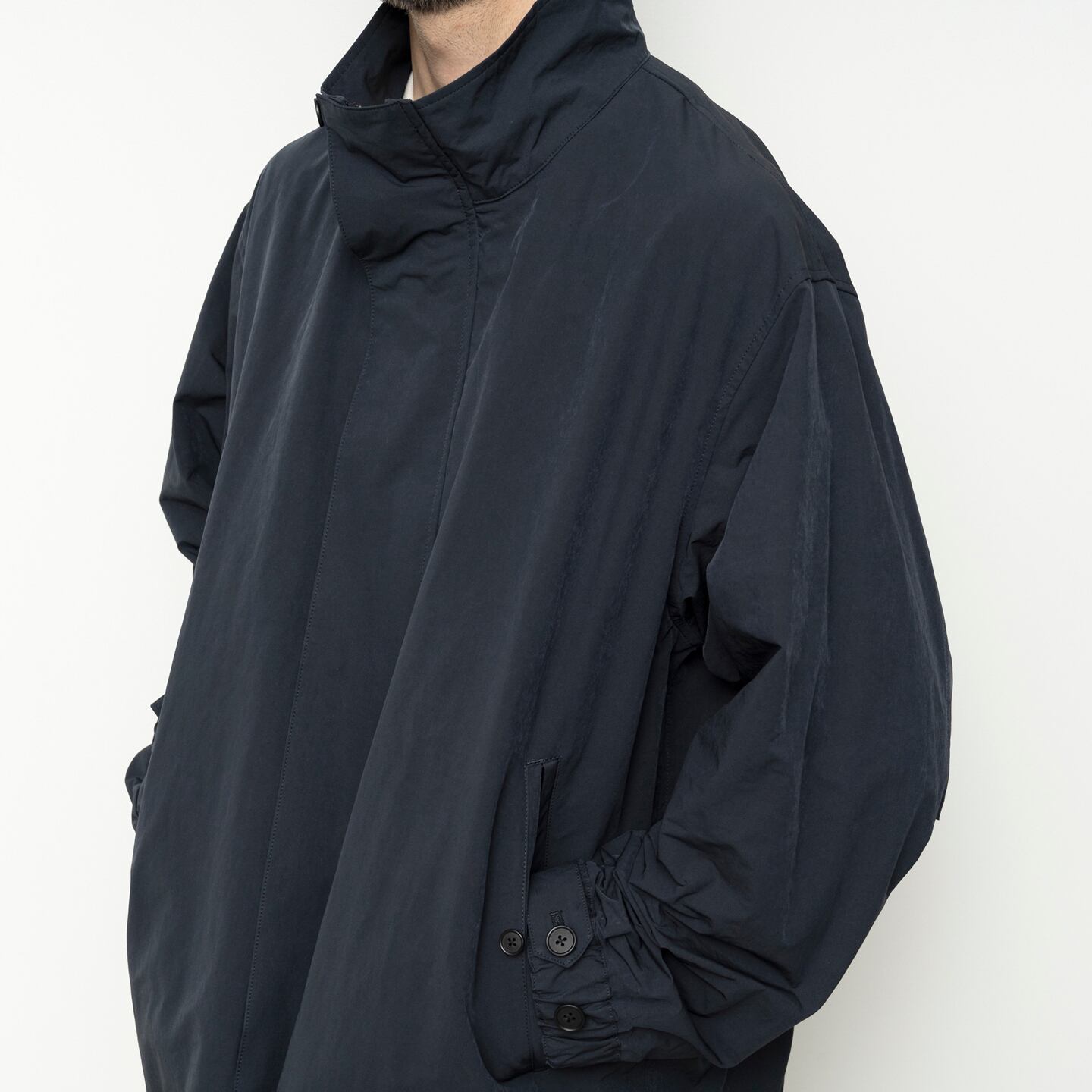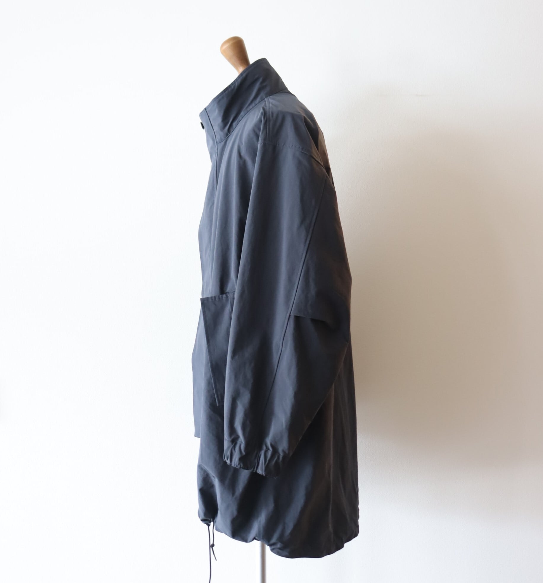 ポリエステルとナイロンの割繊糸の平織素材を使用したスタンドカラーコート。リラックスフィットのアイテムで撥水性もあり都会的なモッズコートのような仕上がりです。