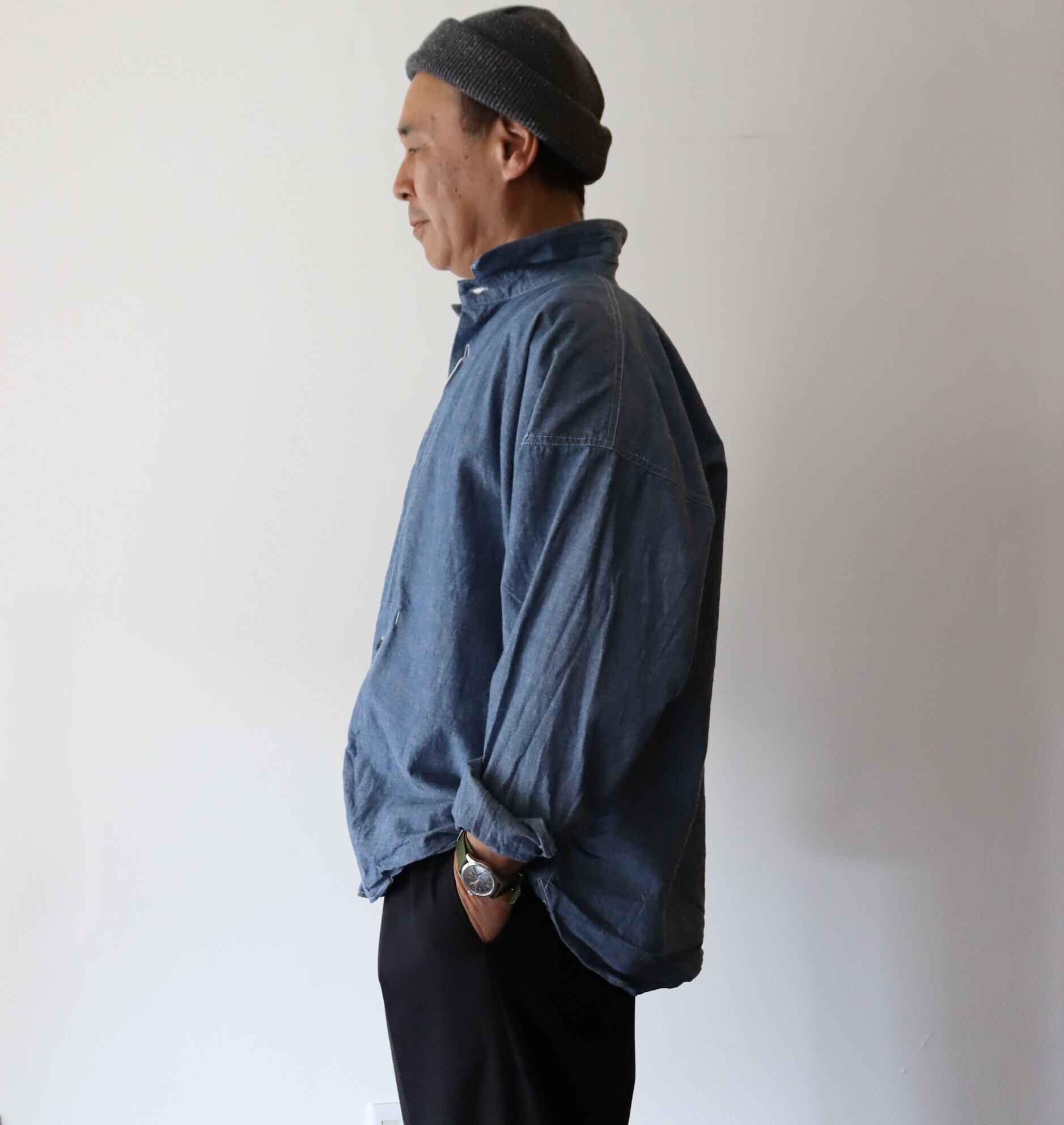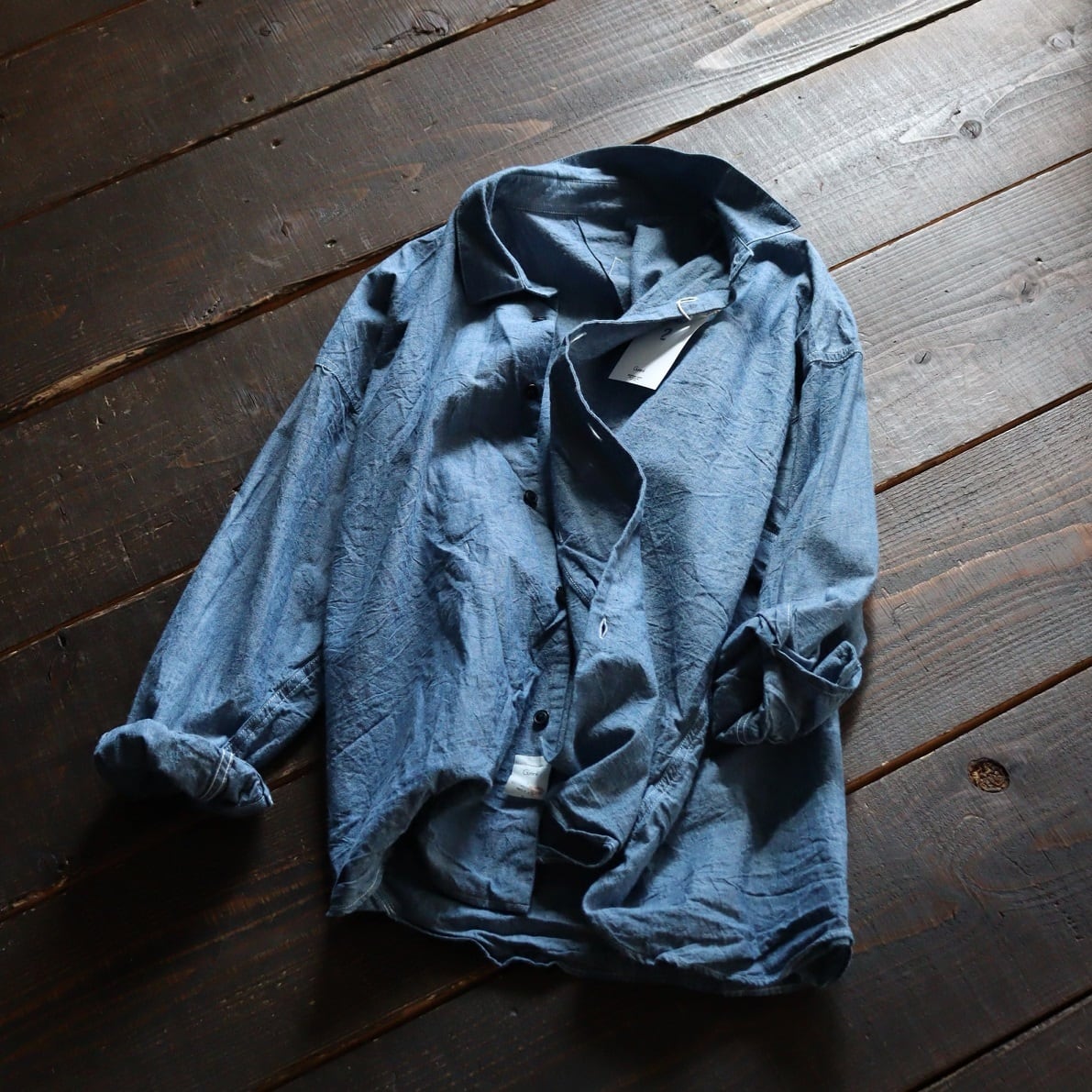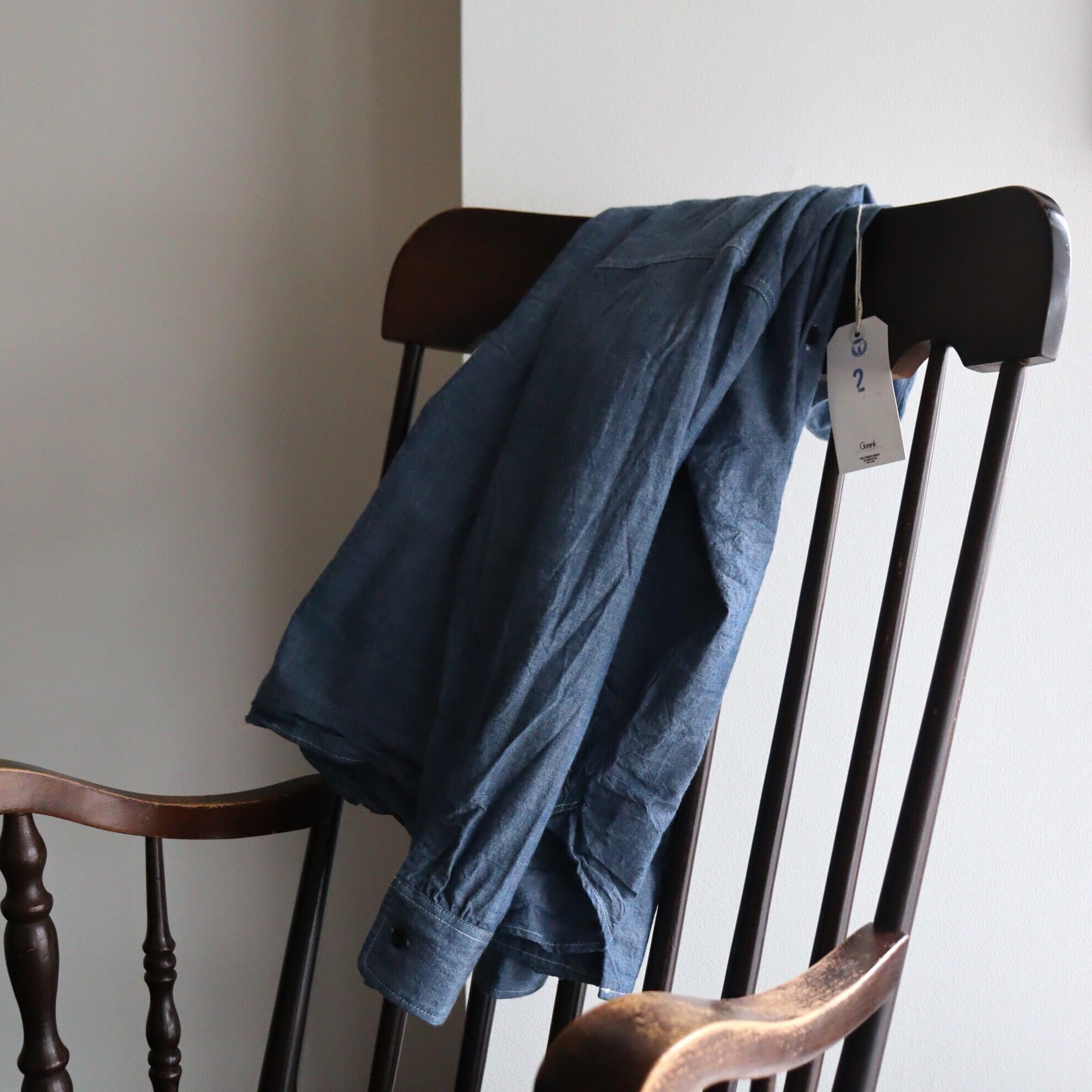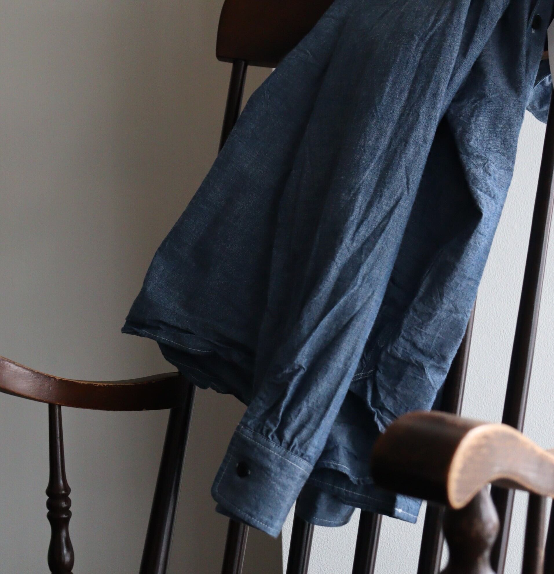 ムラ糸シャンブレーのノリの付いた状態の原反を、一気に縮めるワッシャー加工をかける事により、洗濯してもとれないヴィンテージのような血管ジワを楽しんで頂ける雰囲気抜群の1枚。