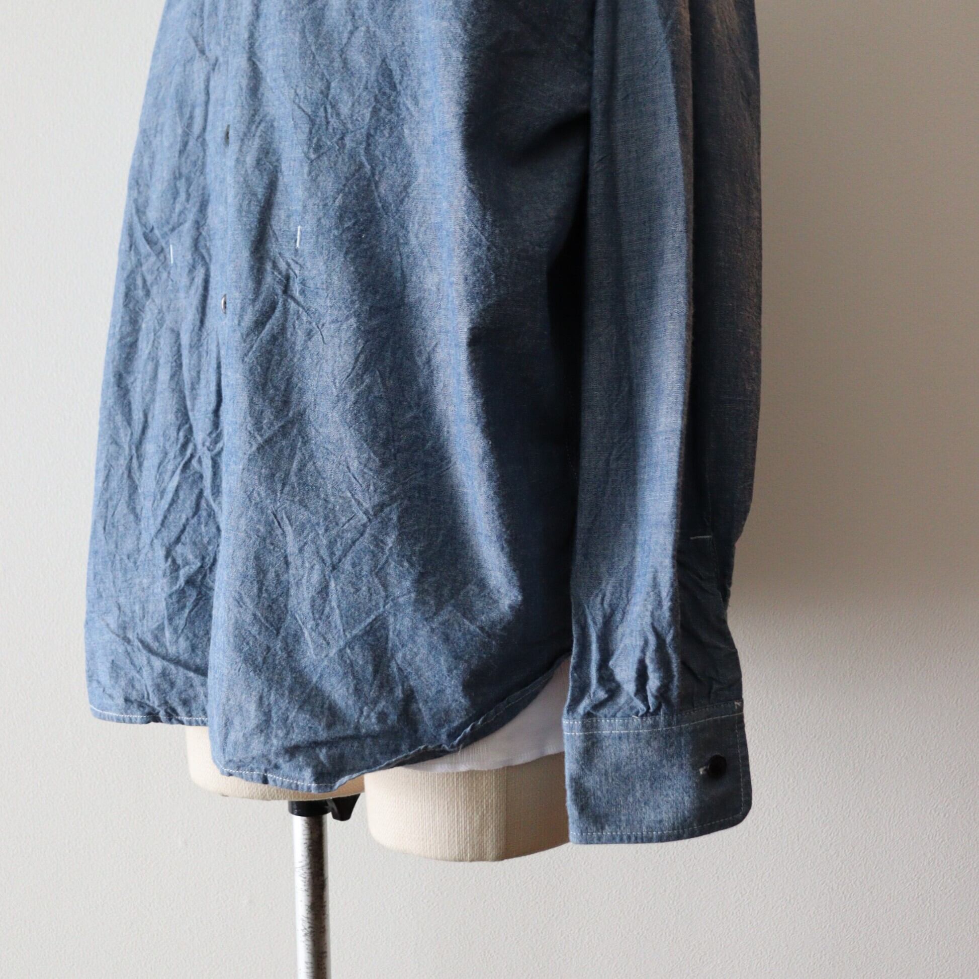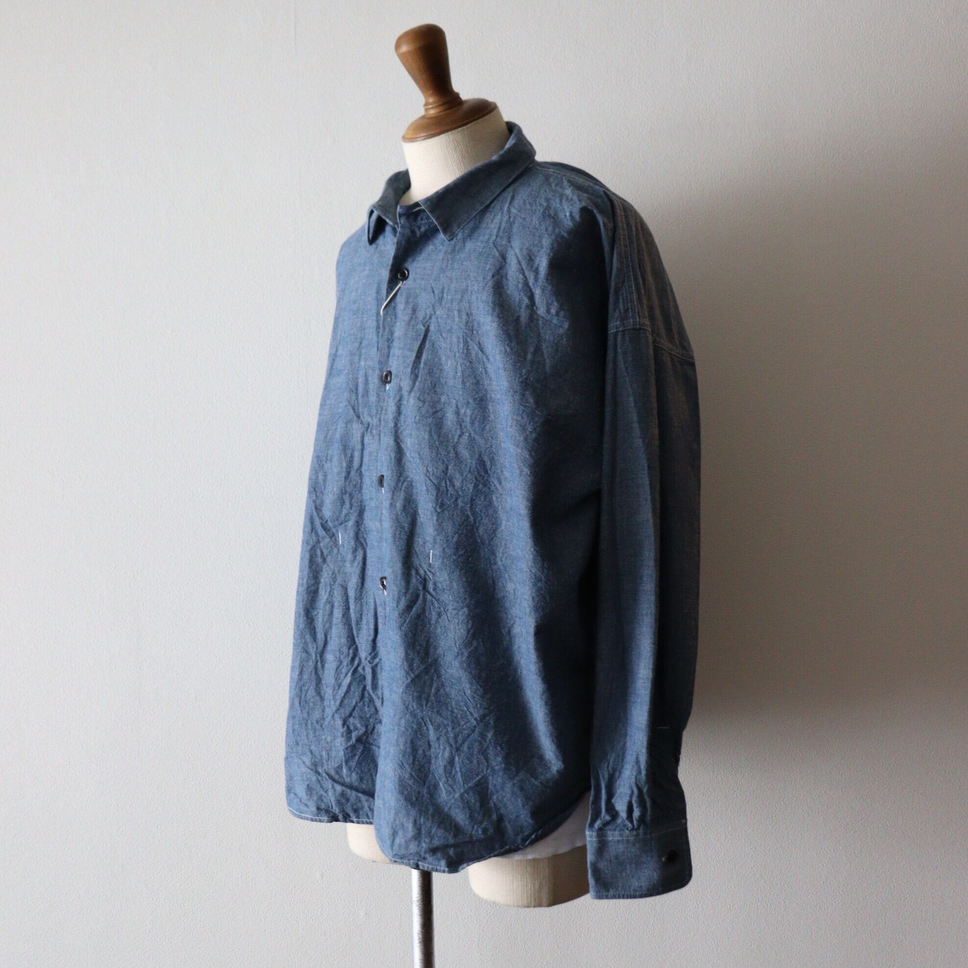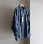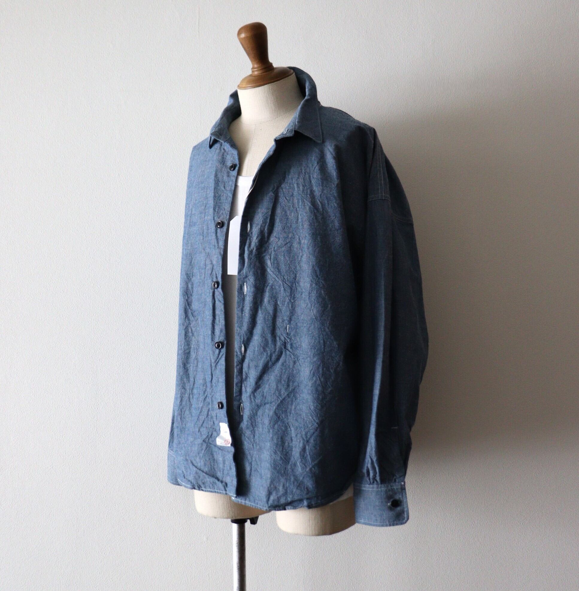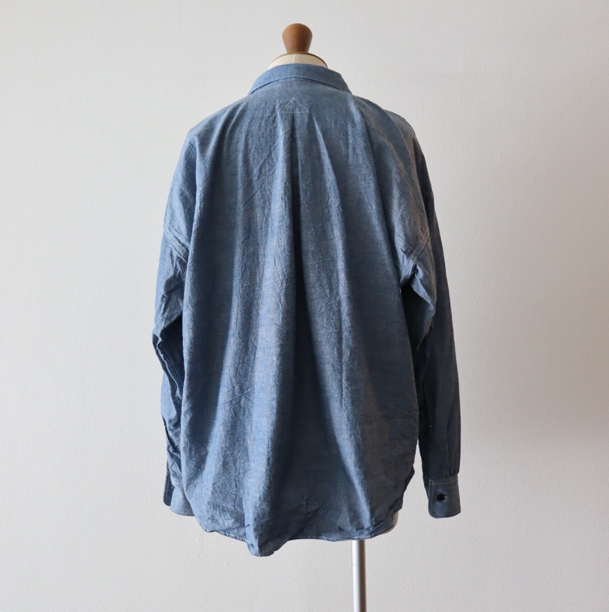 ムラ糸シャンブレーのノリの付いた状態の原反を、一気に縮めるワッシャー加工をかける事により、洗濯してもとれないヴィンテージのような血管ジワを楽しんで頂ける雰囲気抜群の1枚。
