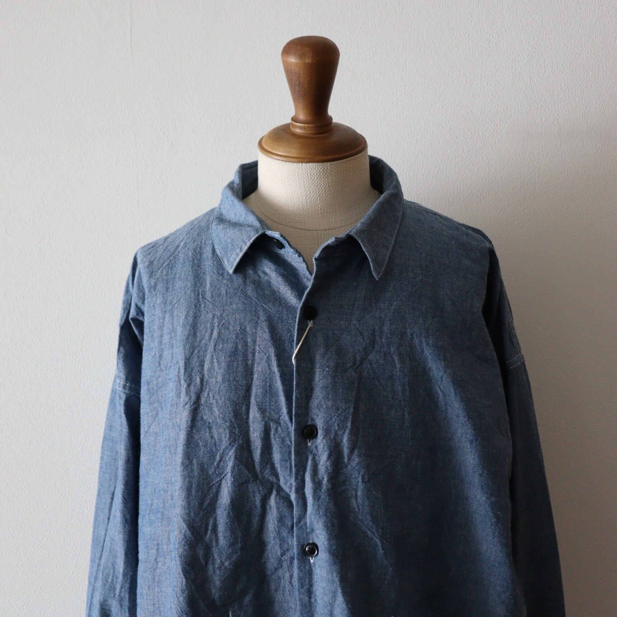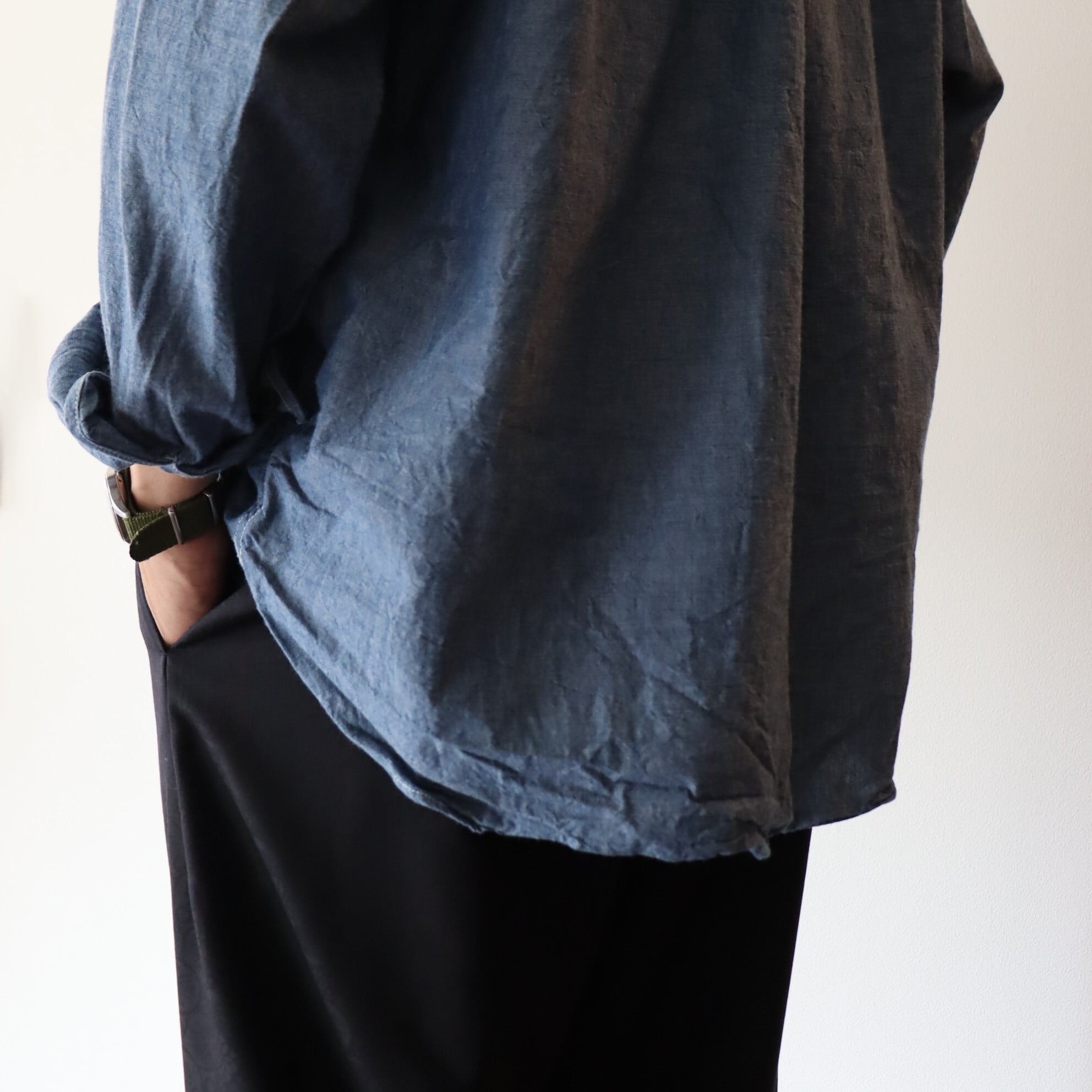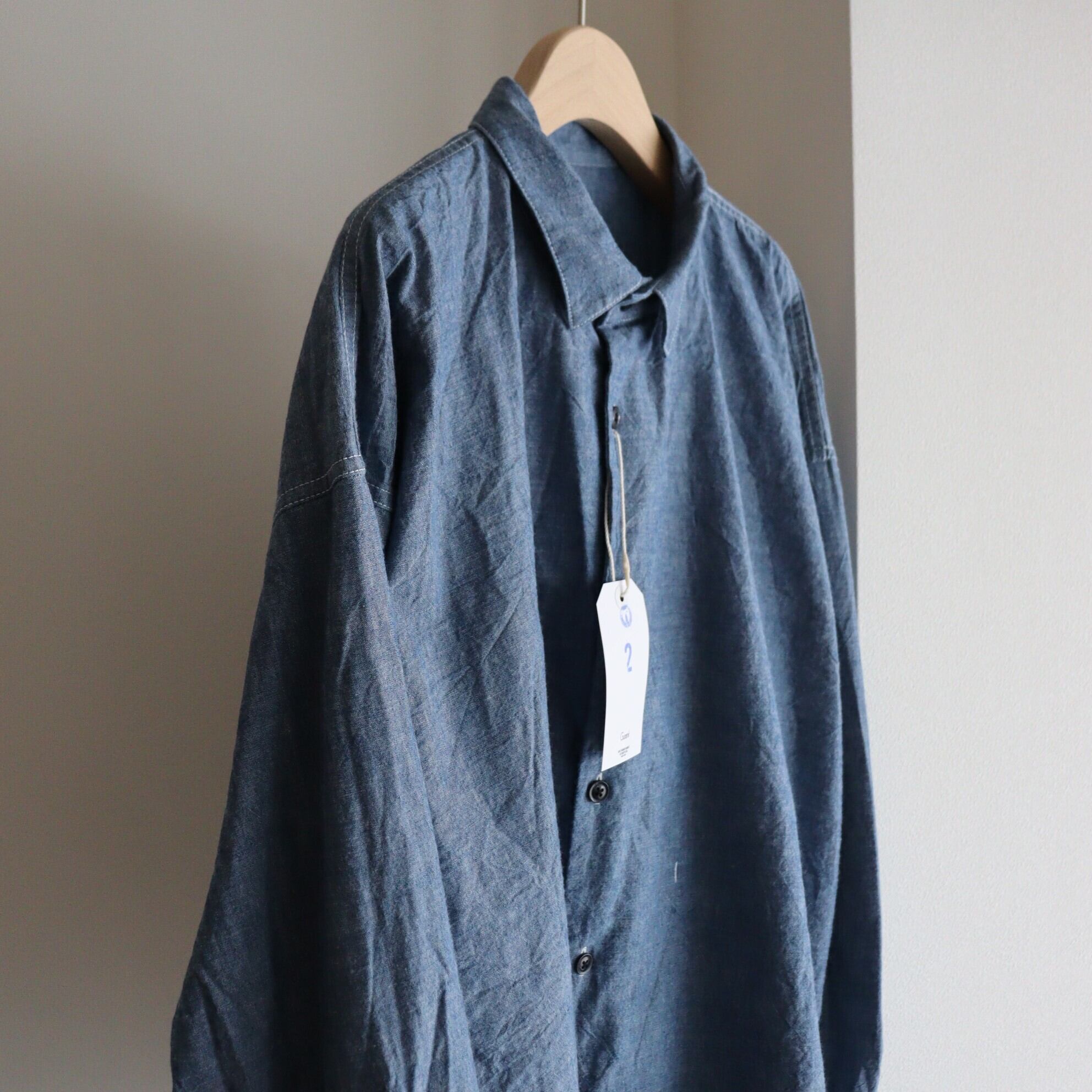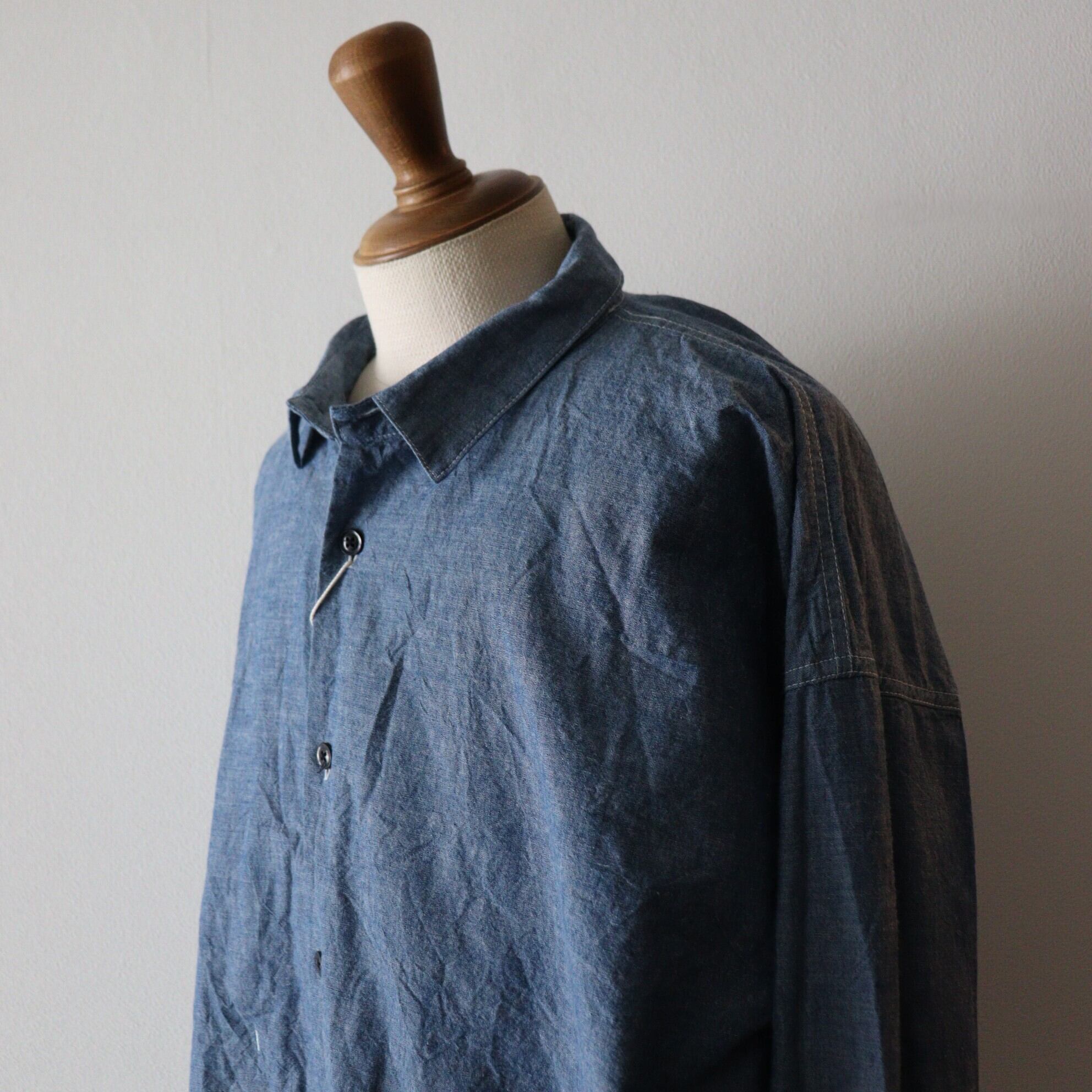 ムラ糸シャンブレーのノリの付いた状態の原反を、一気に縮めるワッシャー加工をかける事により、洗濯してもとれないヴィンテージのような血管ジワを楽しんで頂ける雰囲気抜群の1枚。
