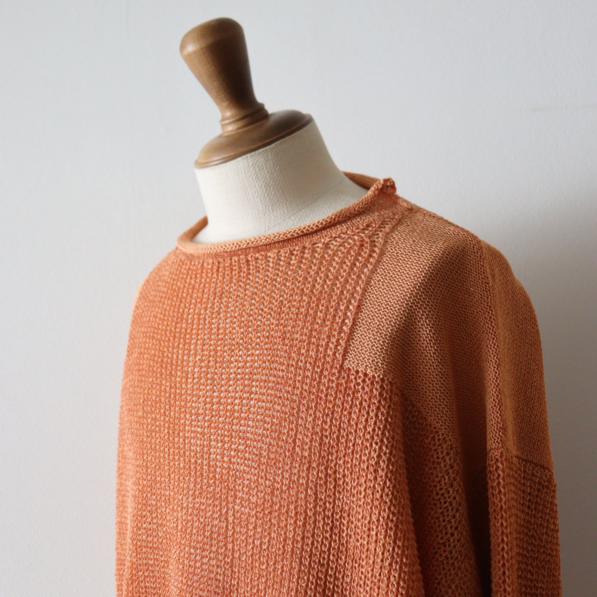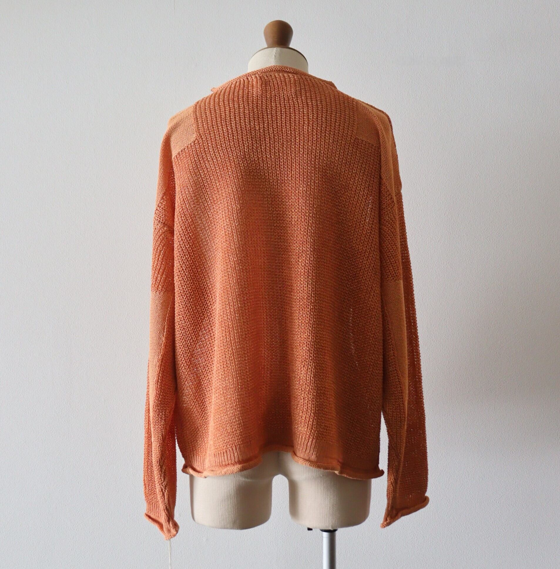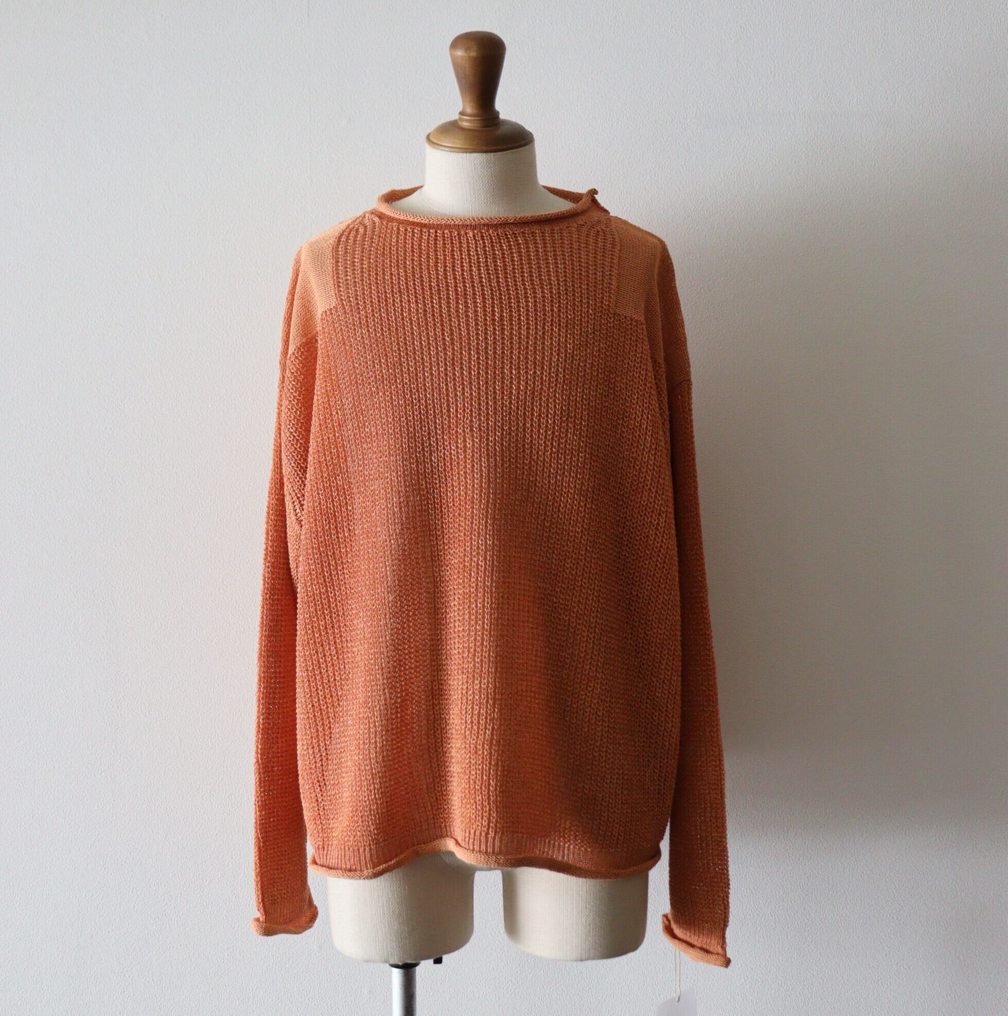 縦に⾛るリブ編みの表⾯感は残すために、⽚畦編みに変更して表⾯感は残しつつ、重くならない編み⽅にしています。袖⼝、裾、衿ぐりは表にクルリと返って来る様に天竺編みの切り替え仕様にし、軽快なアイテムに仕上げています。