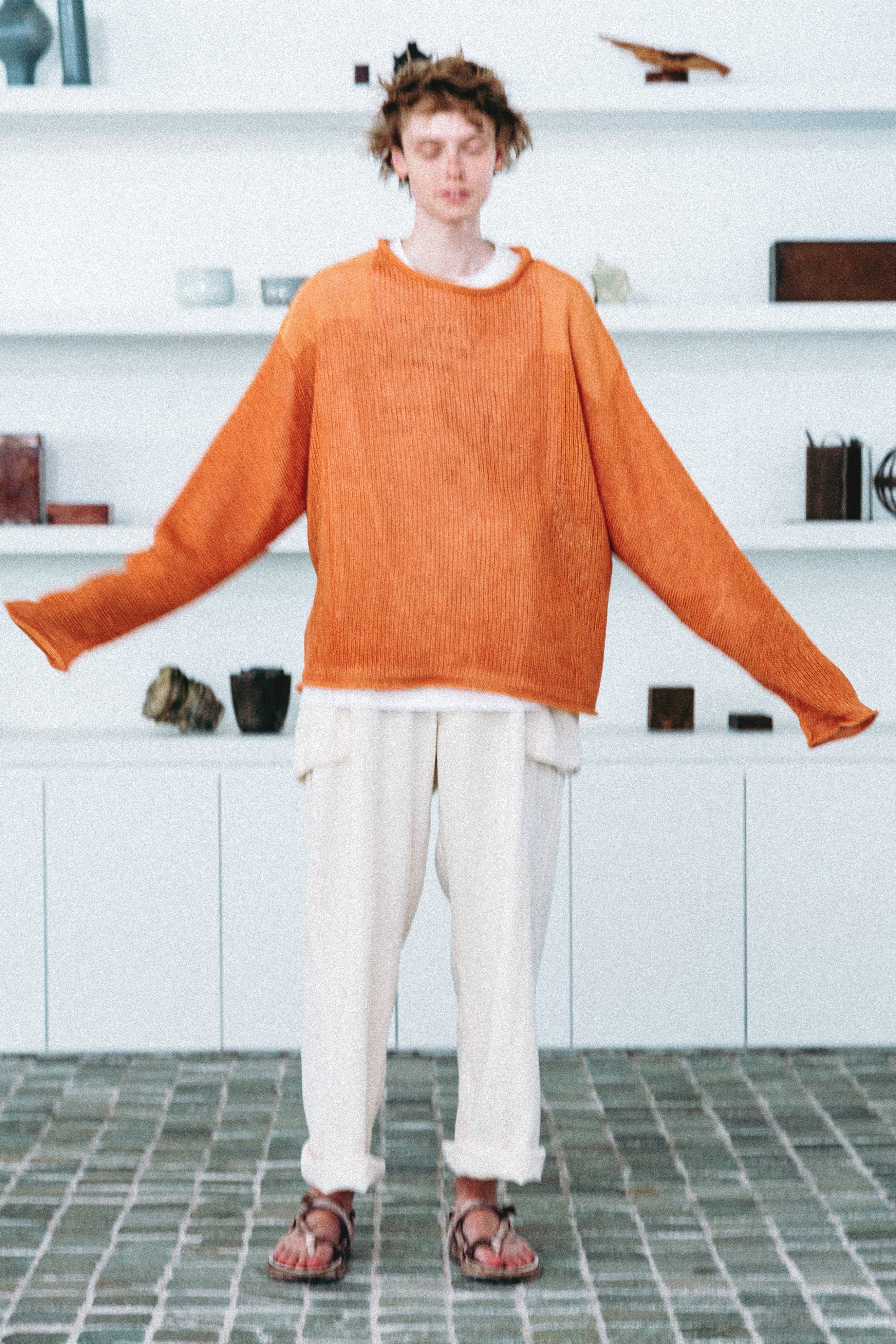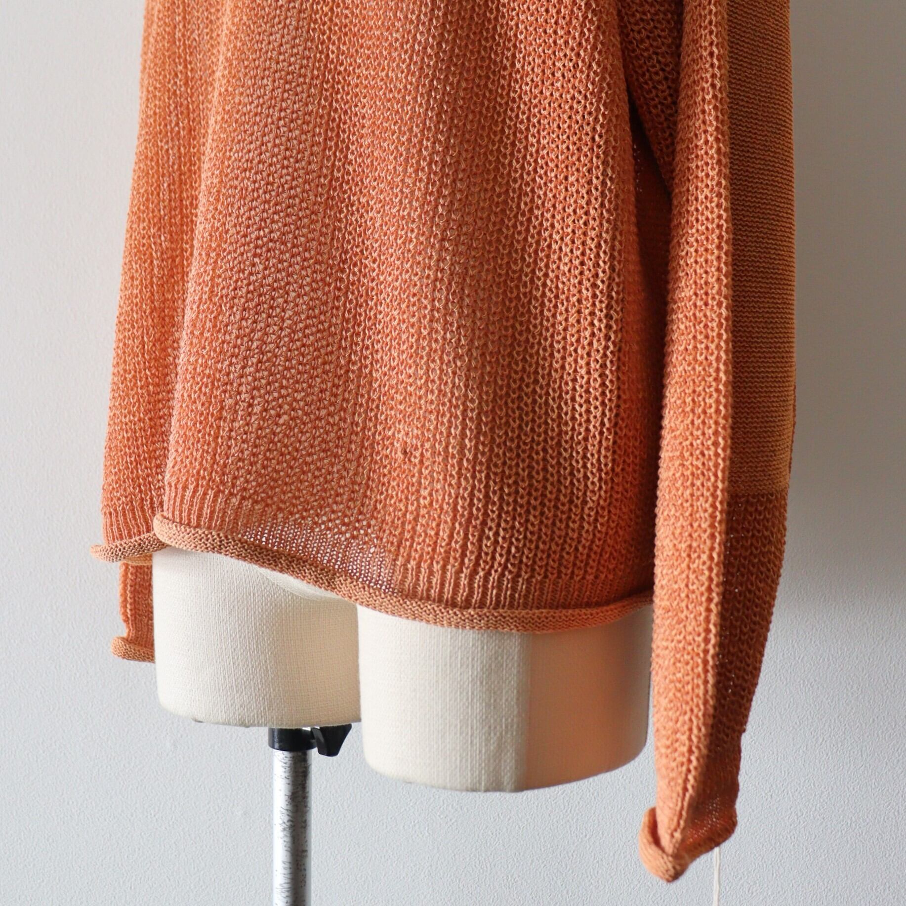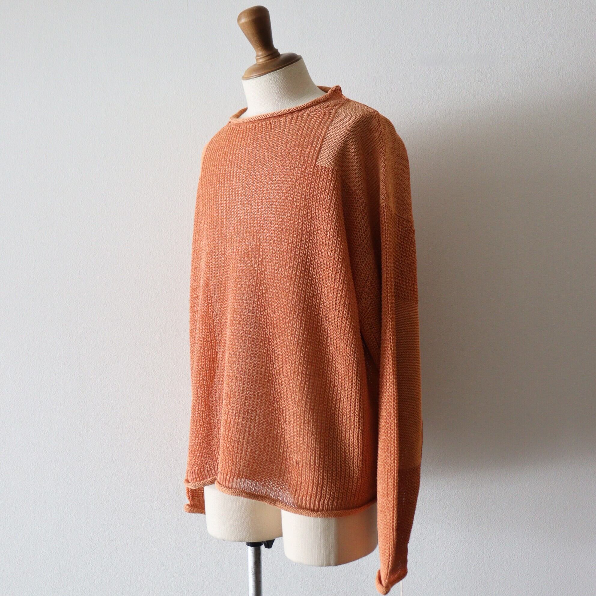 縦に⾛るリブ編みの表⾯感は残すために、⽚畦編みに変更して表⾯感は残しつつ、重くならない編み⽅にしています。袖⼝、裾、衿ぐりは表にクルリと返って来る様に天竺編みの切り替え仕様にし、軽快なアイテムに仕上げています。