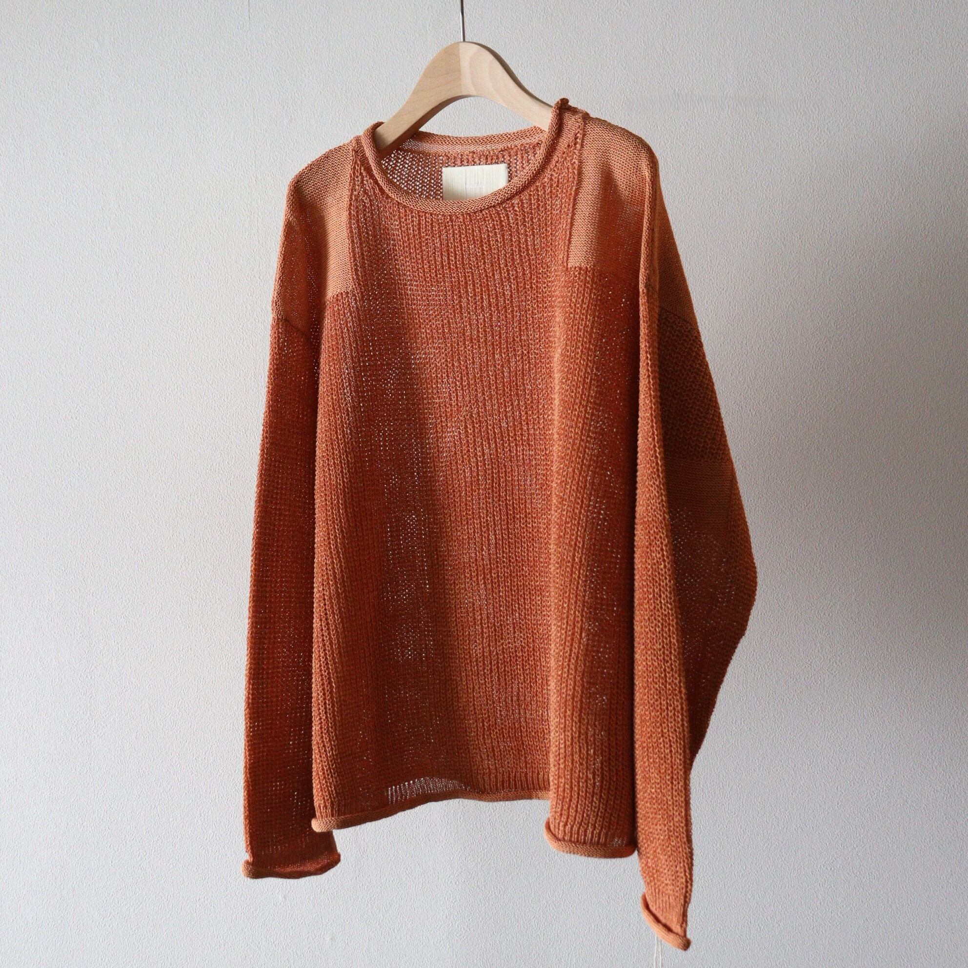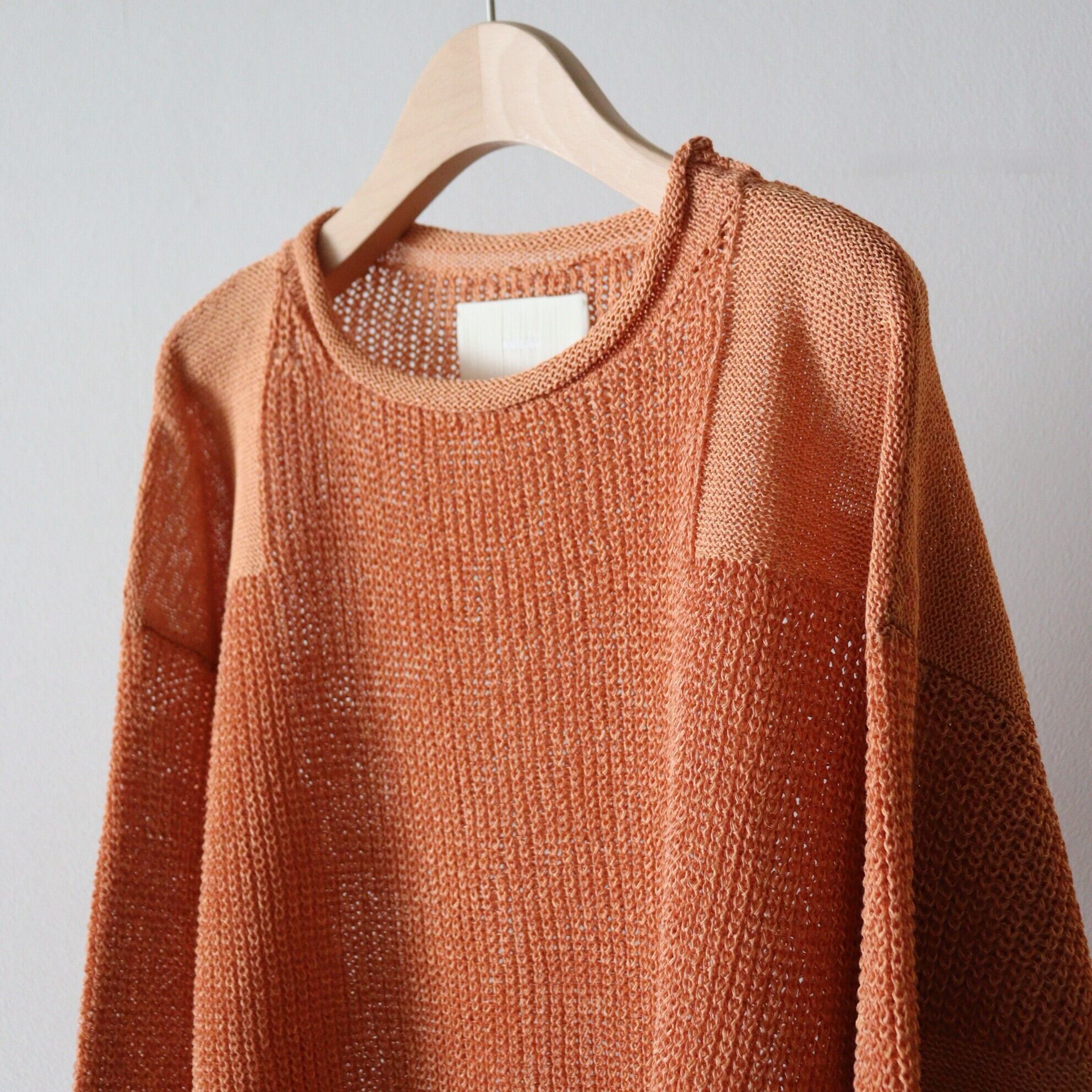 素材は綿⽷を樹脂加⼯で扁平状に糊付けしたギマコットン⽷と和紙混の細い⽷を引き揃えてメランジ調にしています。ギマ加⼯されている⽷がメインになるので、⿇にも似たようなドライタッチで軽くて爽やかな⾵合いが特徴です。冬から春にかけて幅広くお使い頂けるアイテムとなっております。